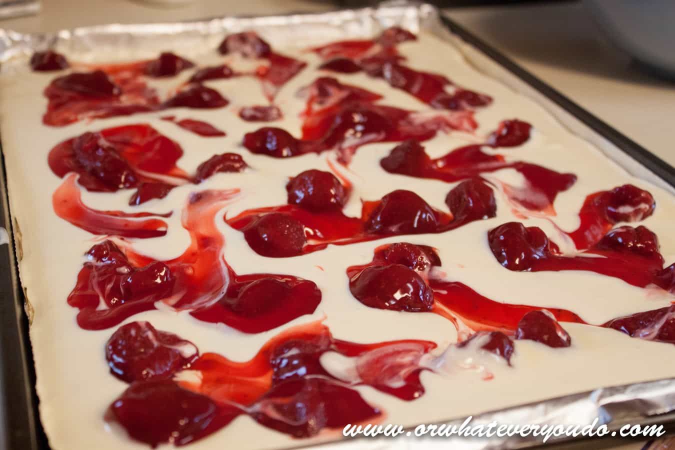 - Pour filling over crust and carefully smooth out to within 1/4 inch of the edge of the crust. Place dollops of strawberry pie filling over the filling mixture at evenly spaced intervals. Carefully swirl it a bit and distribute the berries over the crust and filling.
