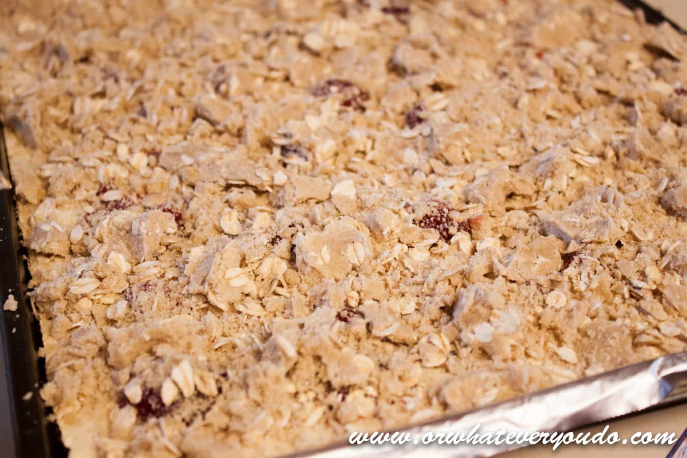 - Mix the brown sugars, white sugar, baking soda, baking powder, and flour. Add the melted butter and mix until everything is moistened. Pour 3/4 of the crumb mixture into the prepared pan and press down firmly. Mix the oats and cinnamon into the remaining crumb mixture and set aside.