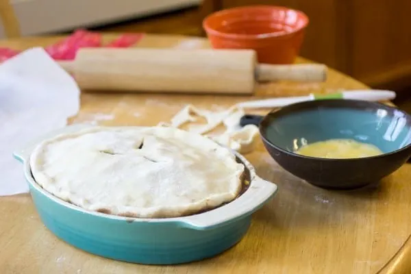 - Lightly flour one large piece of parchment paper. Place pie dough on top, sprinkle a little flour on top, and then add another sheet of parchment. Roll out the pie dough to the size/shape you need for your baking dish, and gently place on top of filling. Trim edges, and roll the edges under a bit. Place a few vent holes in the top of the pie crust. Lightly brush the top with an egg wash.