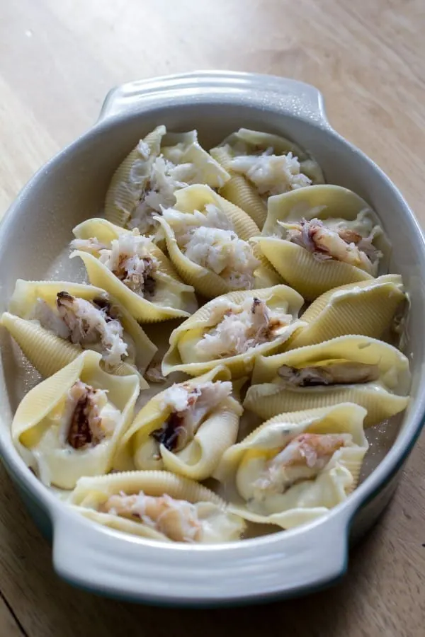 These Dungeness crab stuffed shells are filled with a creamy mix of mascarpone and ricotta that is seasoned lightly with oregano and topped with a large chunk of Dungeness crab.