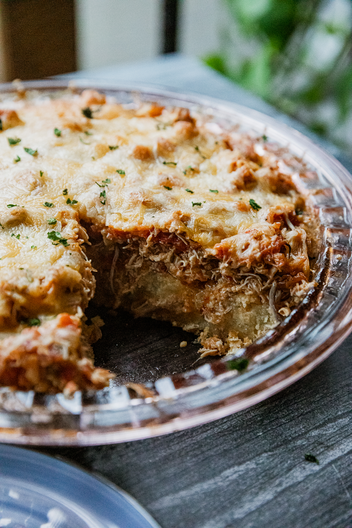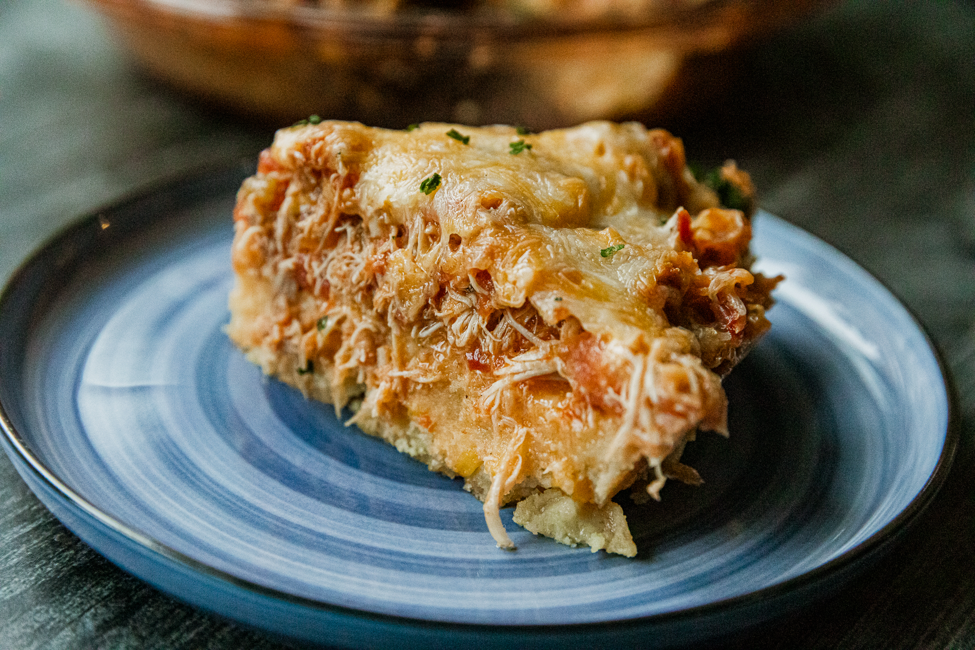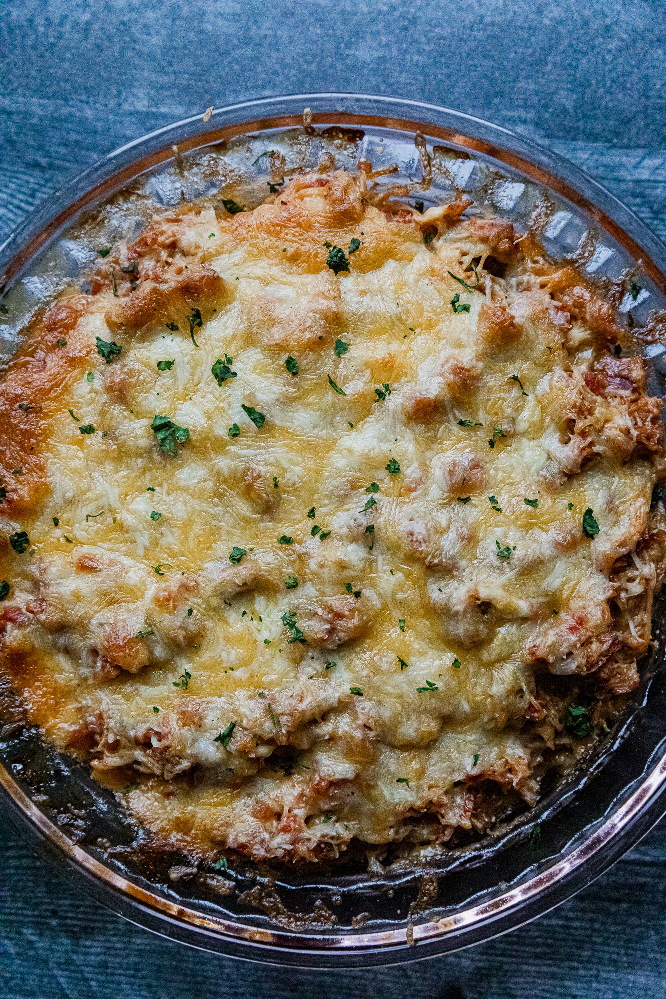 - Shred And Layer – Sprinkle half the cheese over the baked base and let it cool for 10 minutes. Shred the chicken directly in the sauce using a hand mixer. Pile the chicken and sauce over the base.