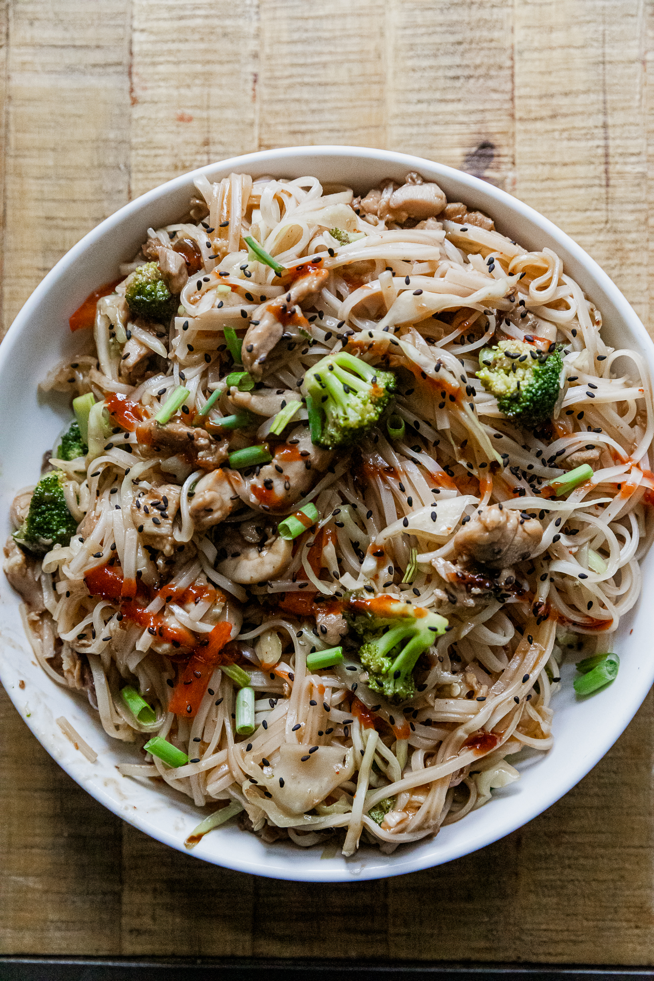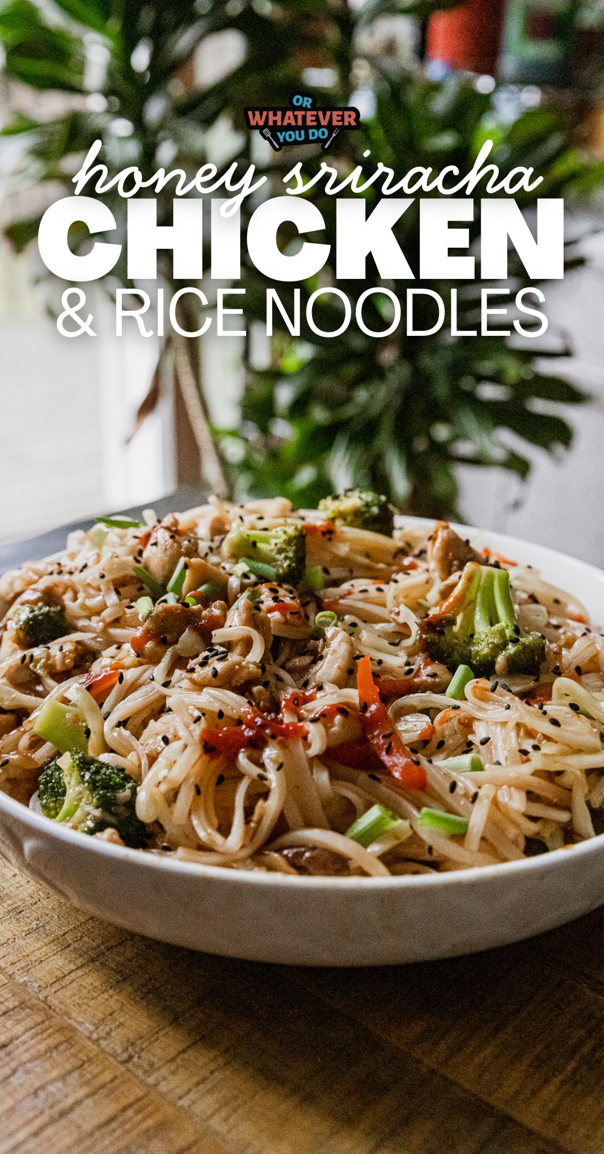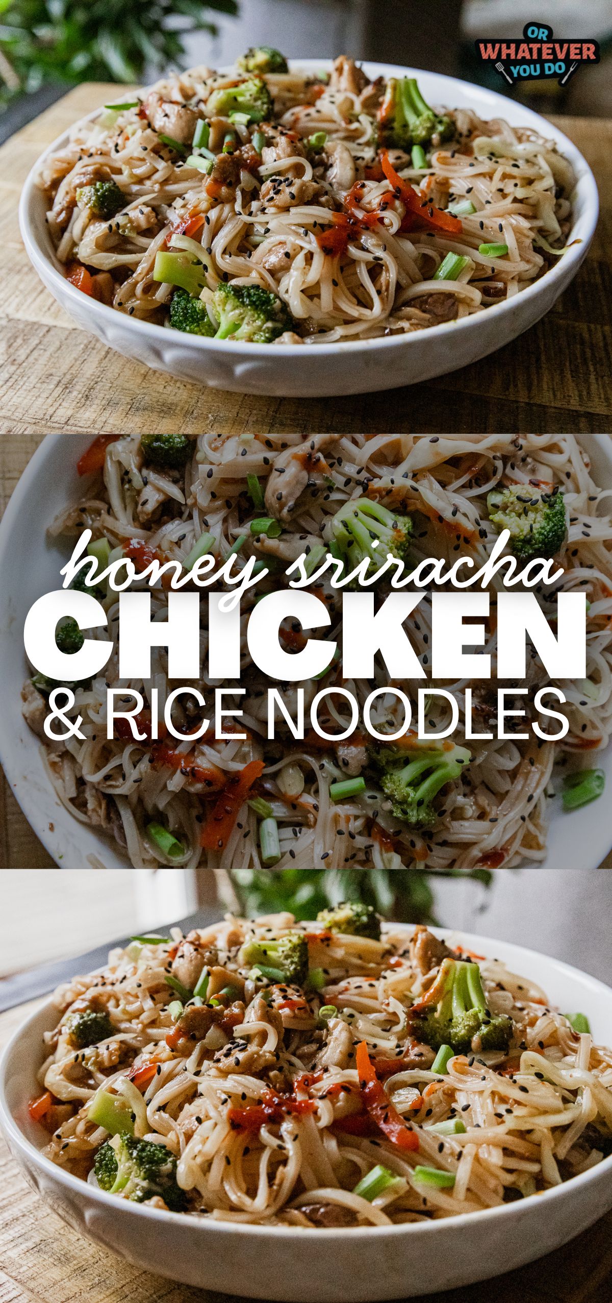 Delicious rice noodles are the base for this super flavorful honey sriracha chicken recipe. Your whole family will love it!