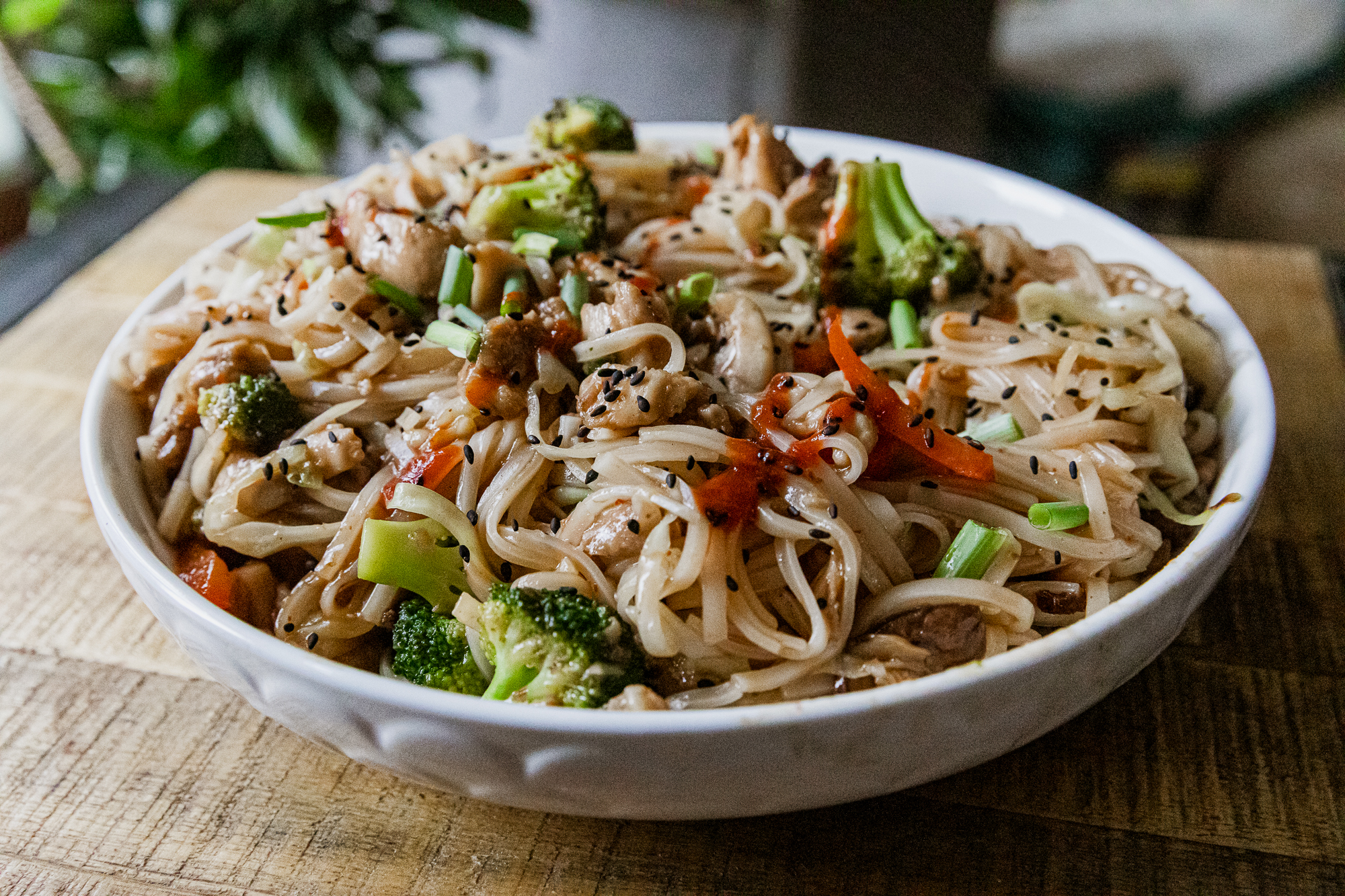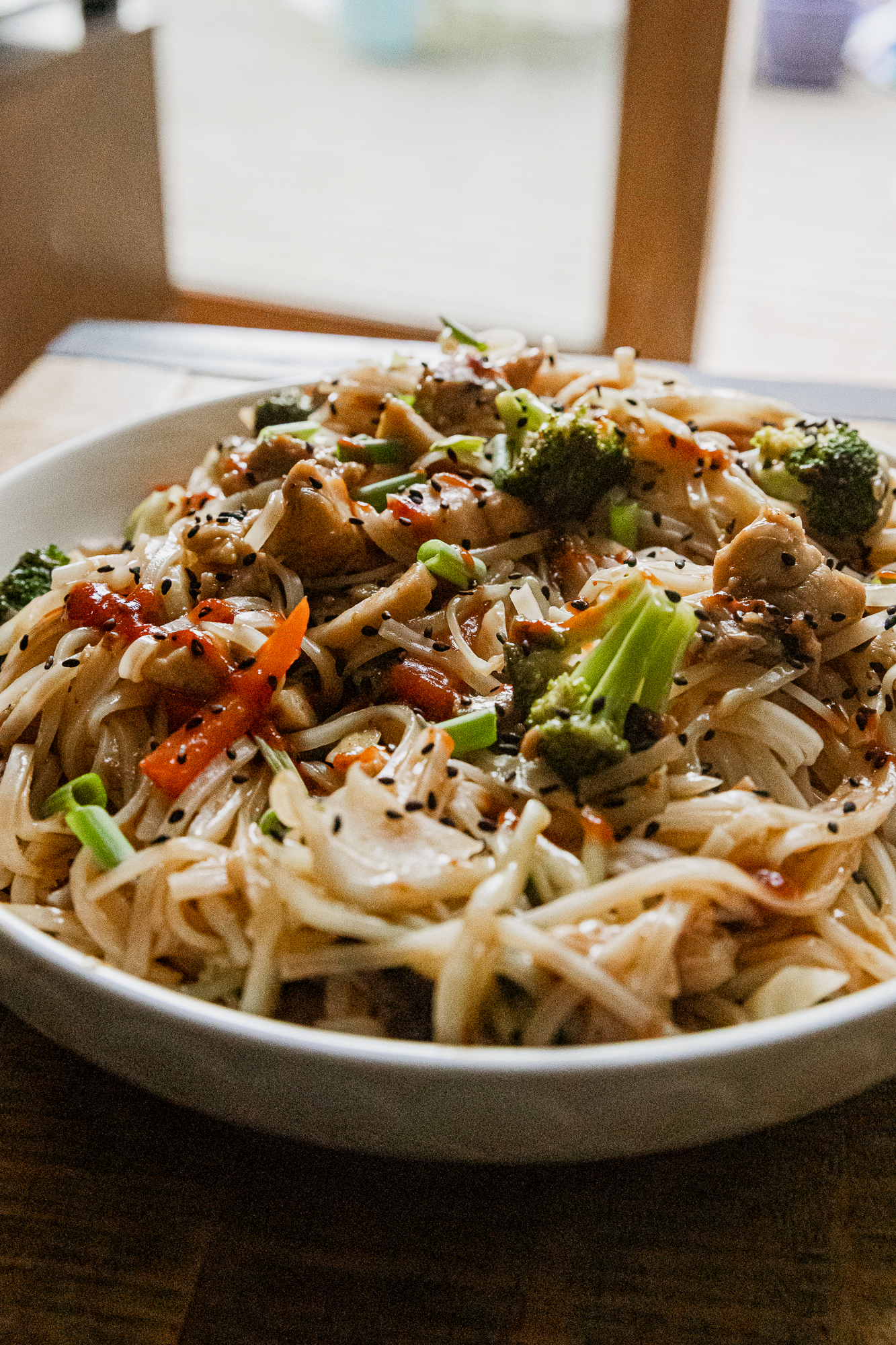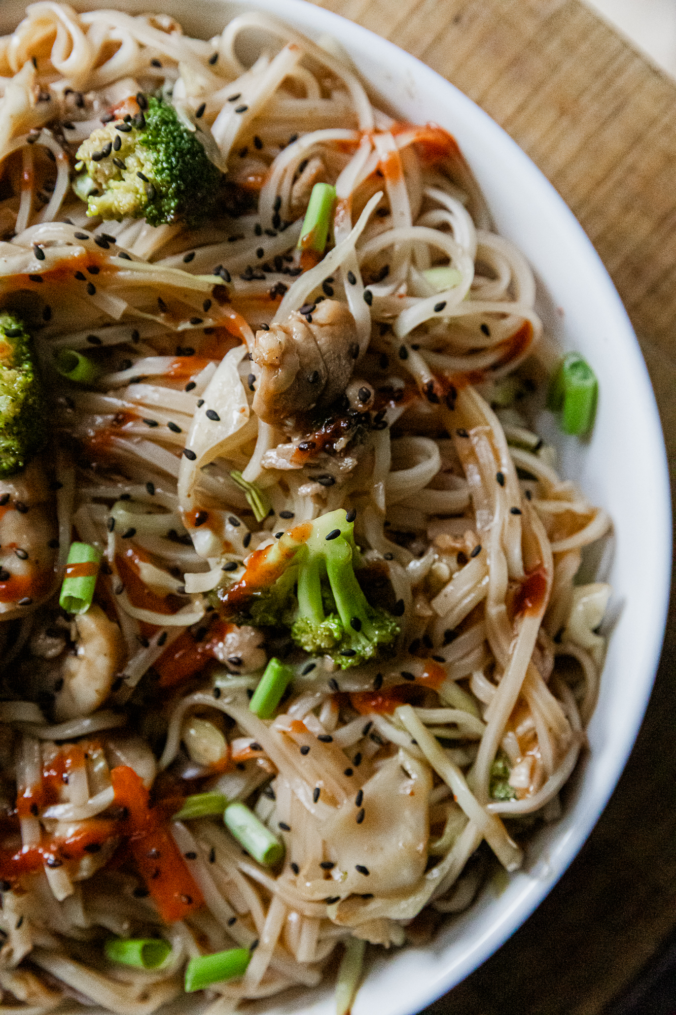 Delicious rice noodles are the base for this super flavorful honey sriracha chicken recipe. Your whole family will love it!