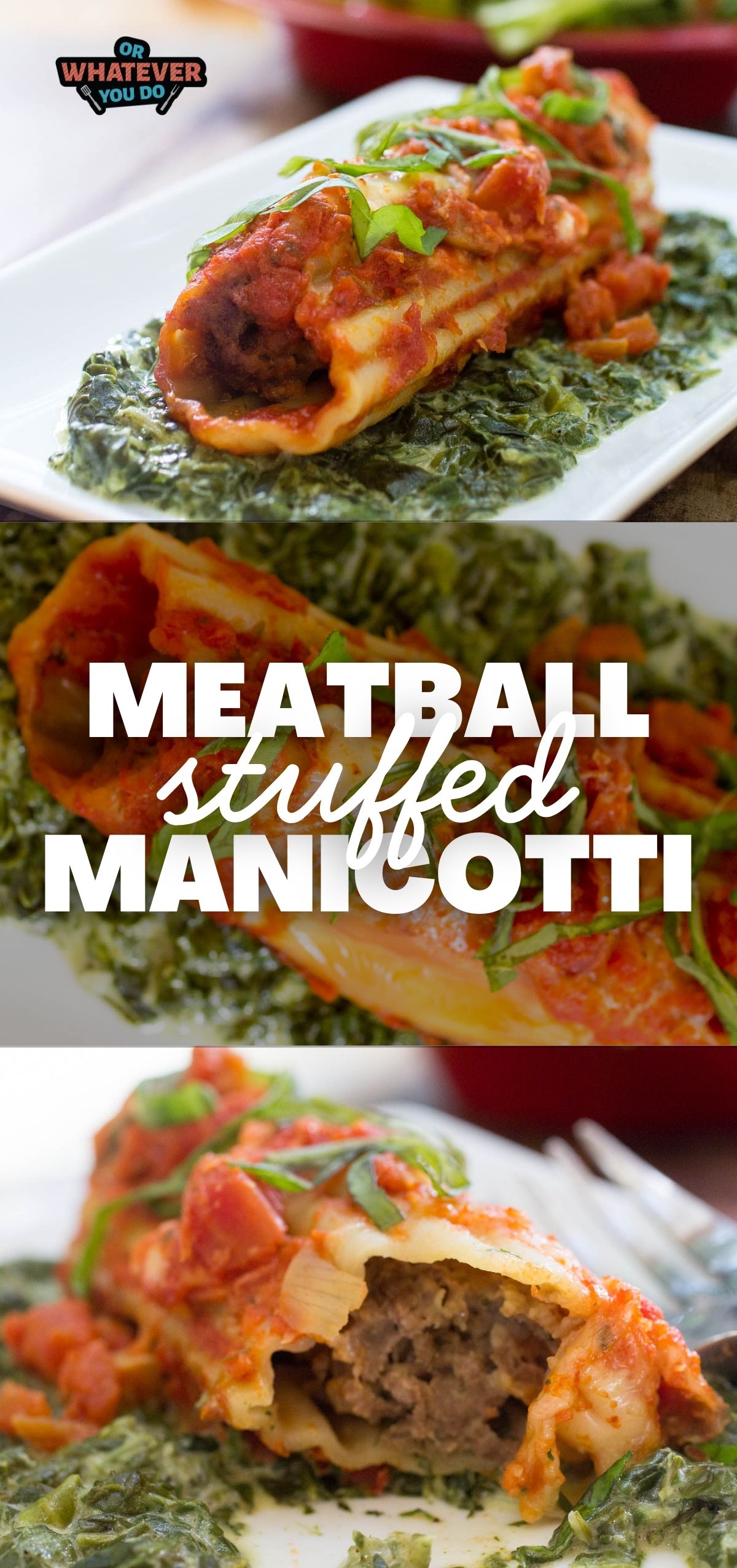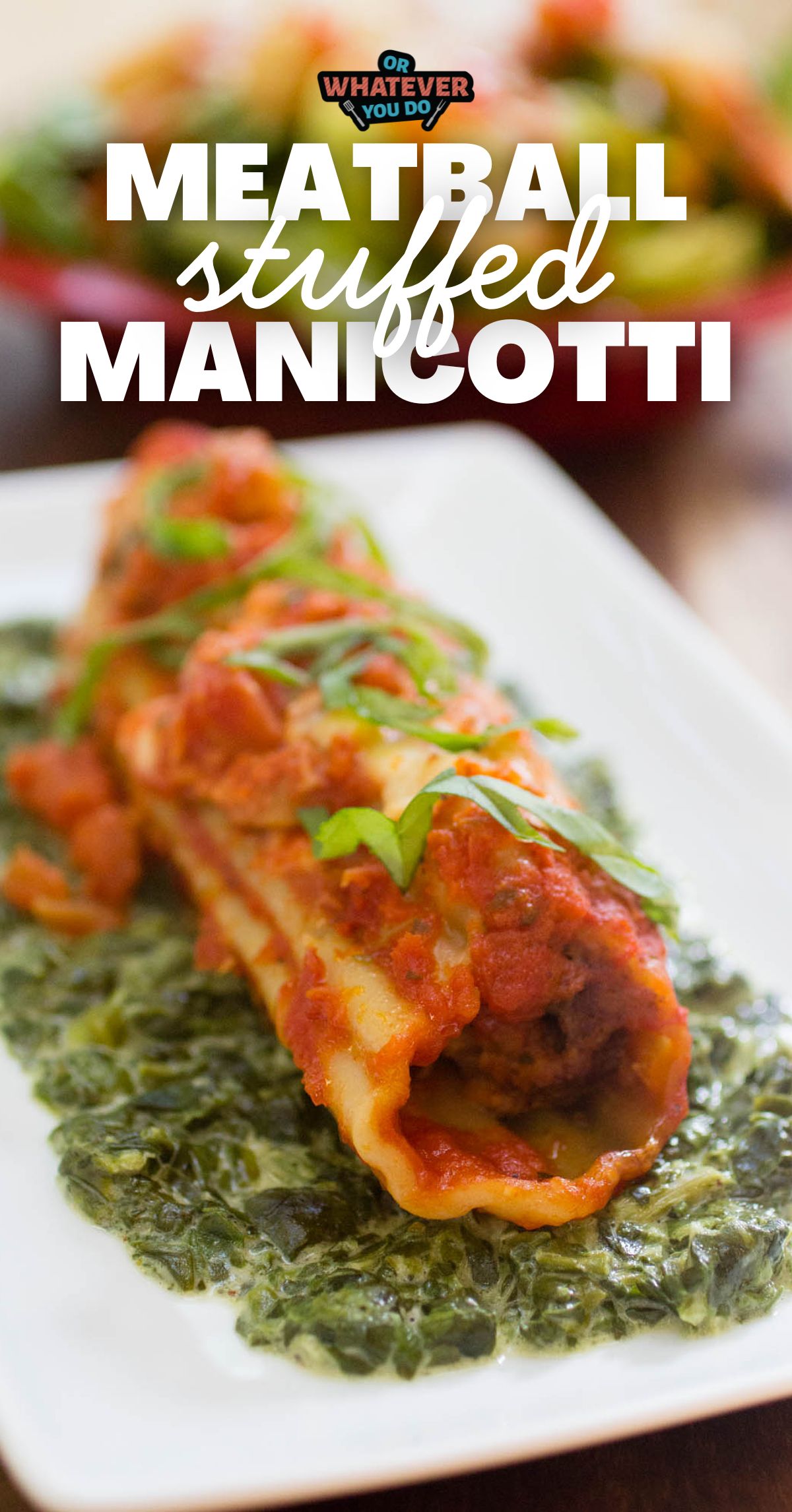 Easy manicotti noodles stuffed to the brim with meatball stuffing, and then placed on a bed of spinach and drenched in marinara. Your whole family will love this easy homemade pasta recipe!