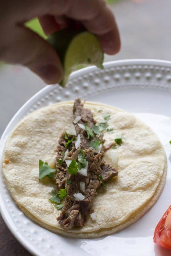 - Remove the flank steak from the pot, chop into bite-sized pieces, and serve with cilantro, onion, lime, and corn tortillas.