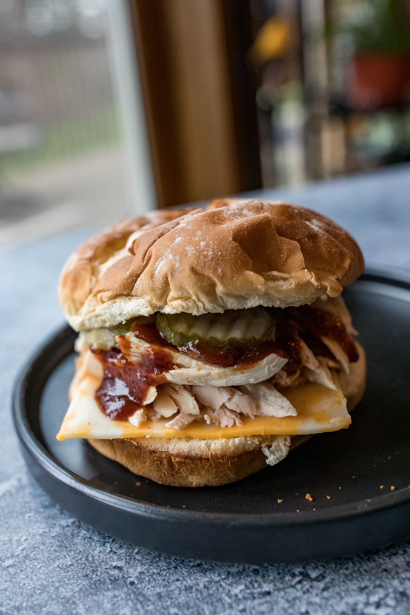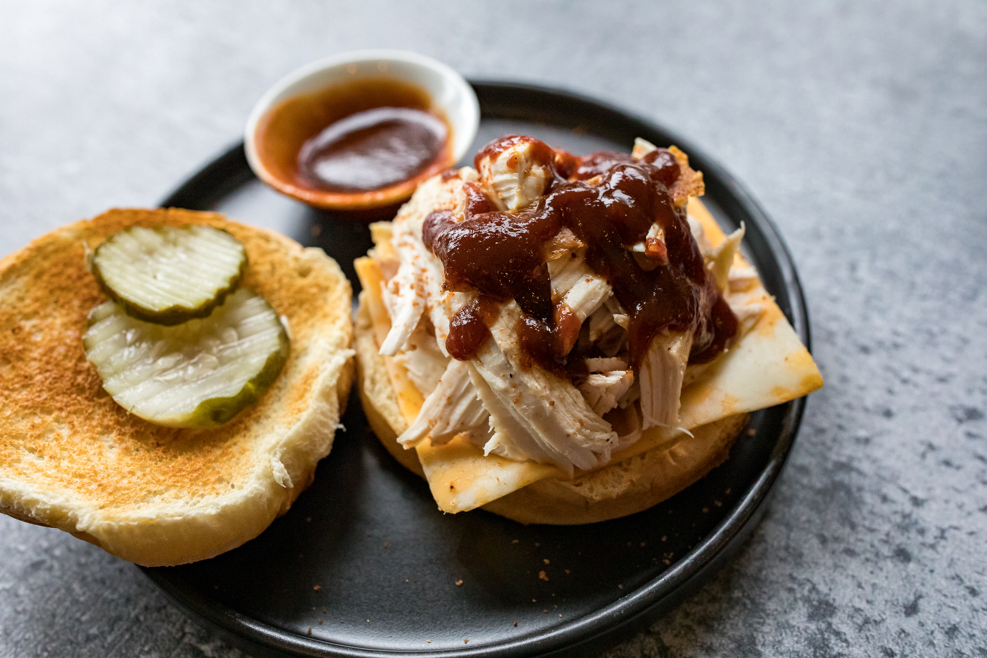 - Add chicken to the tops of toasted buns, and top with pickles, cheese, and more barbecue sauce.