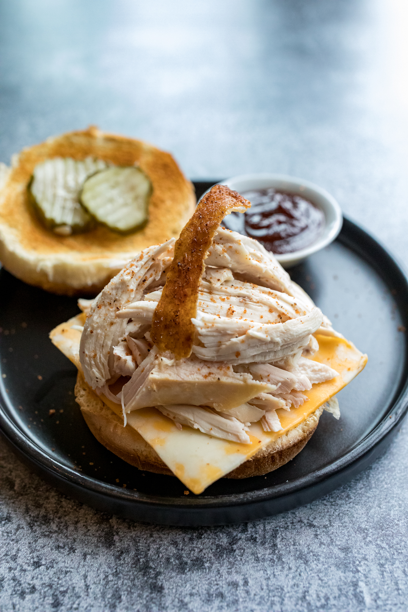 - Toast buns, and season the meat with some of your favorite chicken rub. Pile it up on the toasted buns.