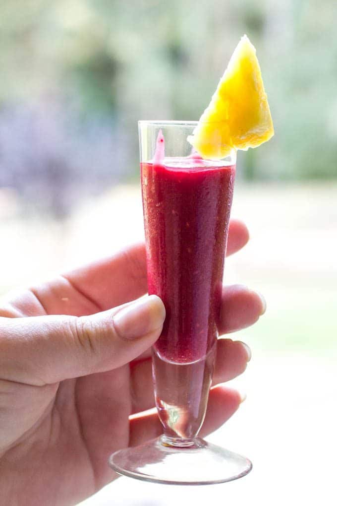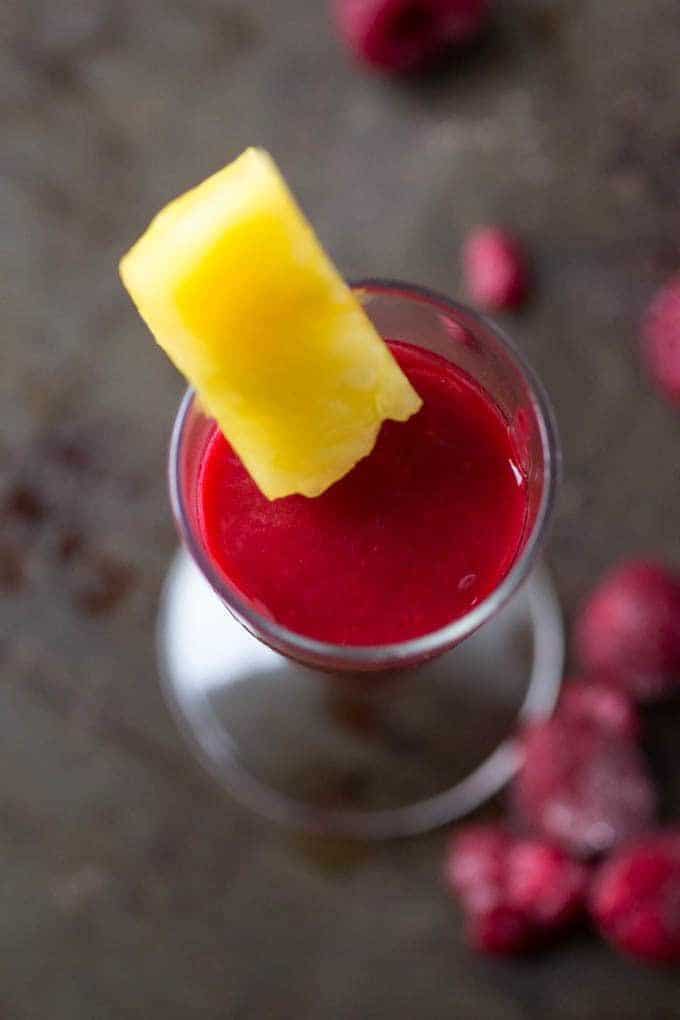 I used some frozen raspberries from last year’s harvest in this drink, but you can use fresh if you’d prefer. I would definitely recommend freezing them first though, as that is what gives this drink it’s awesome frozen texture. In fact, if you really want to get crazy I would also suggest freezing the pineapple juice into ice cubes too. 😉 Totally optional, but totally amazing.