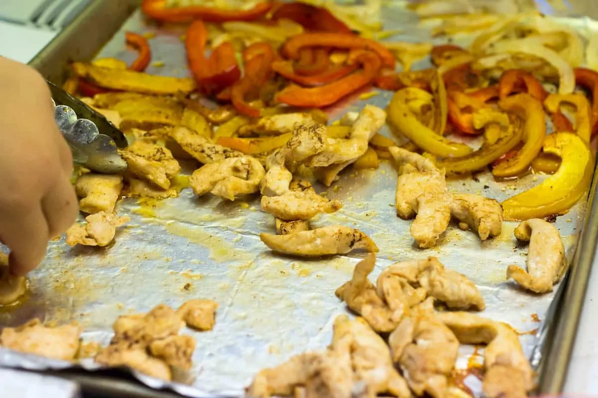 - Cook – Quickly pour the chicken and peppers onto the preheated cooking sheet and spread out into a single layer. Let cook for 8-10 minutes, or until the chicken is no longer pink.