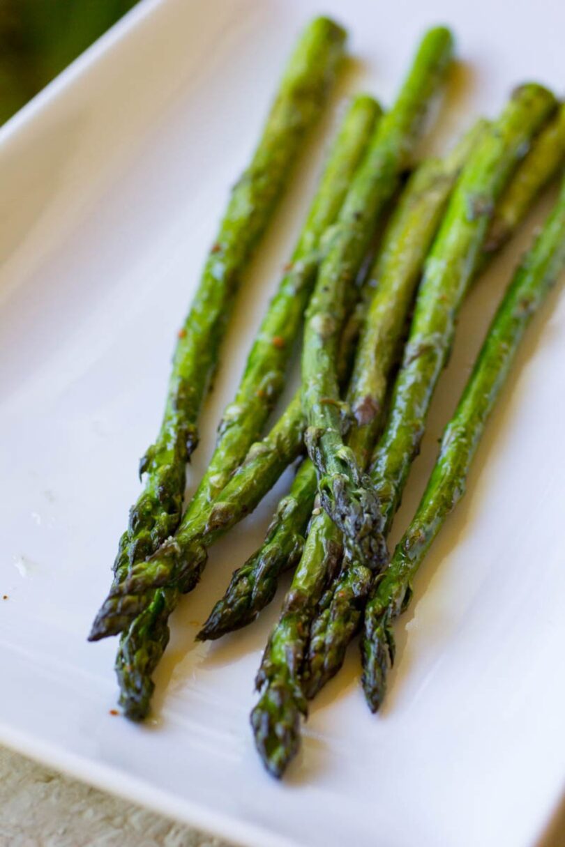If you have troubles with wide grill grates and don’t want your vegetables directly on the grill, another great tip is to use a broiler pan for grilling. It keeps your asparagus contained, so they don’t slide through the grates but allows some smoke to get through from the bottom.