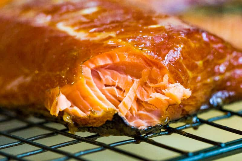 - Glaze - Brush your salmon with real maple syrup every 30 minutes while the fish smokes. It should take around 3-4 hours, but the time really depends on how thick your filets are. When the fish flakes easily, it is done.