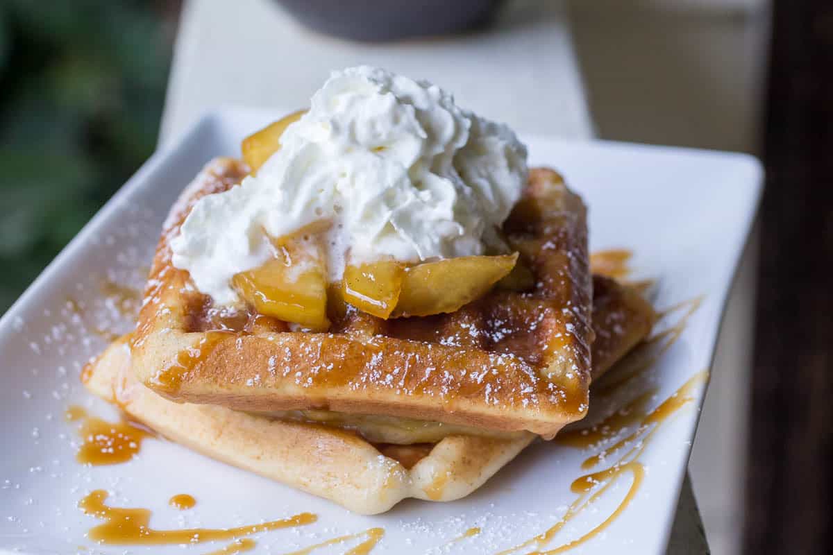Apple Pie Spiced Waffles are flavored with apple juice and an apple cider drink packet, and topped with tender skillet cooked apples, sweet caramel sauce, and cinnamon whipped cream.
