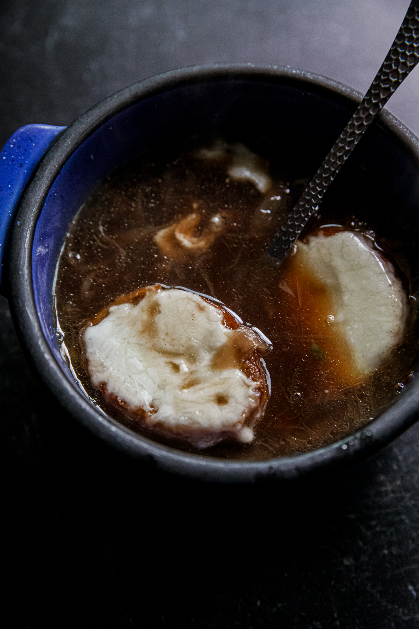 - French Bread – Toasted until crisp. Holds up in the broth and under the cheese.