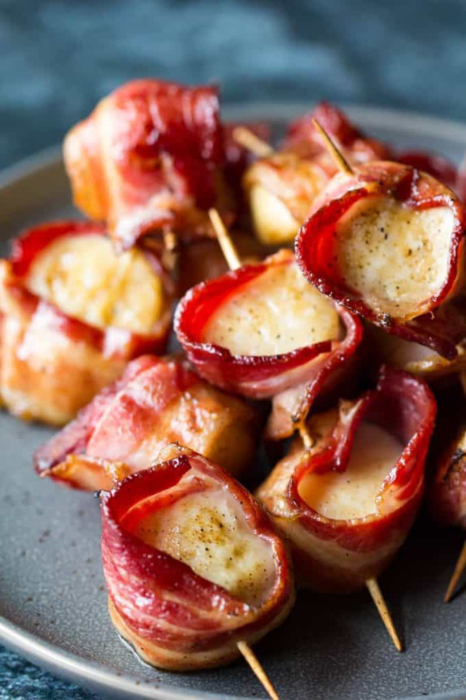 - Wrap in a cut piece of bacon and secure with a toothpick.