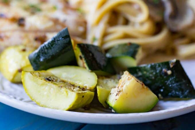 I leave the skins on my zucchini and yellow swuash. Leaving the skin on helps to give the squash and zucchini more of a sturdy texture. Without it, I think it would just fall apart as it is grilled. It also tastes good, and isn’t bitter like some cucumber skin can be.