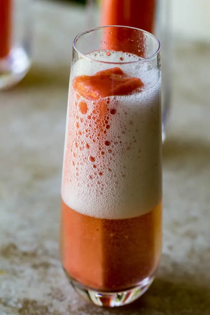 - Place into glasses and pour bubbly over the top. Serve.