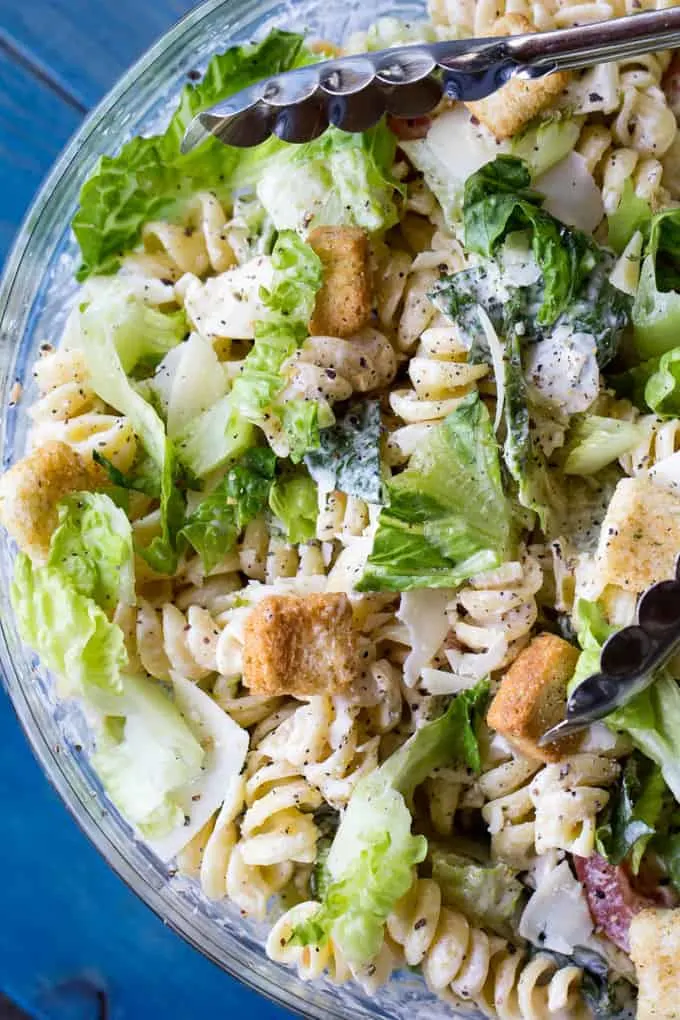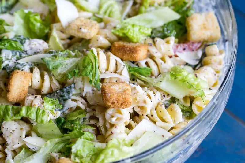 I highly prefer the traditional romaine lettuce for Caesar salads, and for this easy caesar pasta salad as well. Bonus points if you do grilled romaine.