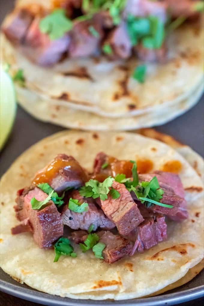 Tender steak is marinated and quickly grilled to a perfect medium-rare, and then served with warm tortillas and all of the fixings.