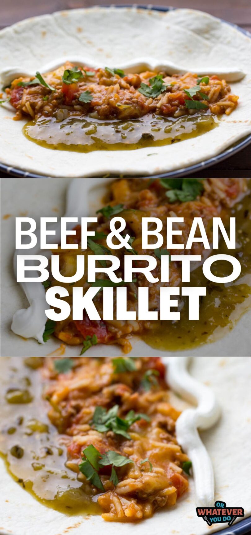 Simple beef and bean burritos with rice all made in a skillet! Load up a flour tortilla or serve with a big bowl of chips. Easy family dinner!