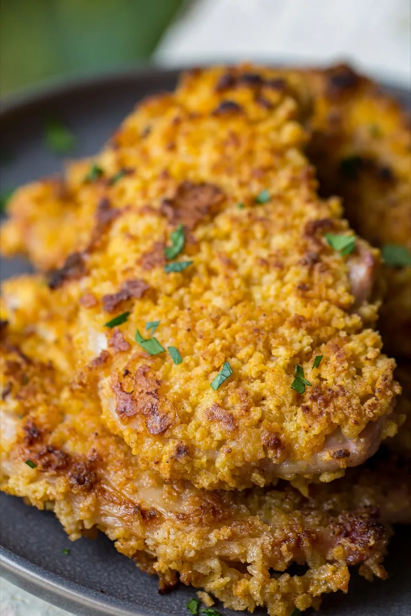 - Cook it – Place the breaded chops on a grill-safe parchment lined baking sheet. Cook for 10-15 minutes, flip, and continue cooking until the other side is crispy and browned.