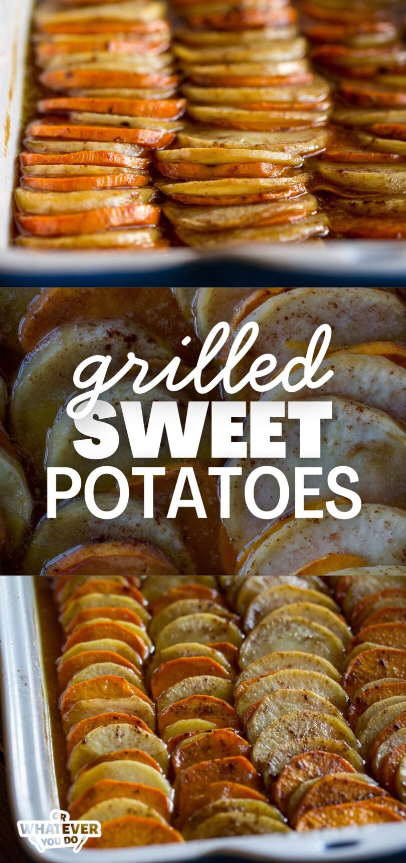 My sweet potatoes are sliced and layered in a big grill-safe pan, and then have a brown sugar bourbon sauce poured all over them before being baked off in the pellet grill for about 45 minutes to an hour.