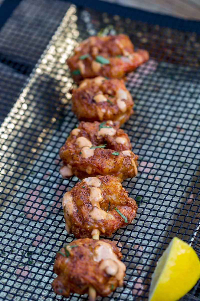 No need to put on too much oil once the batter sets. If you have an oil mister handy, that makes it easy. Just be careful around the live fire. I recommend pulling the shrimp off, misting them lightly, then putting them back on the grill.