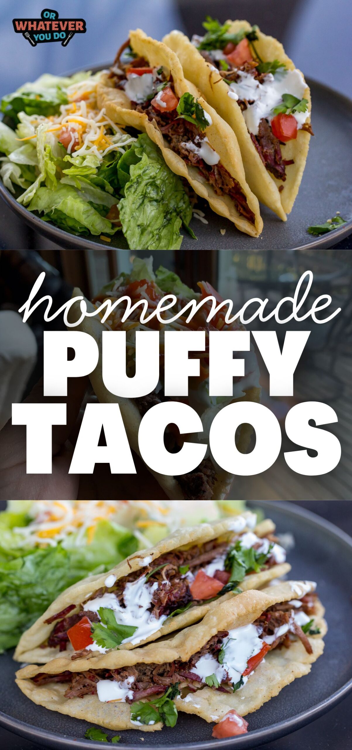 Puffy taco shells are delicious, they take about 5 minutes to mix up, and 2-3 minutes a shell to fry. If you’re making these for a big crowd you might want to throw things at the end, but for 3-5 people at 2-3 tacos each, it is a manageable amount. Find a friend and fire up two pots of oil if you need some extra hands.