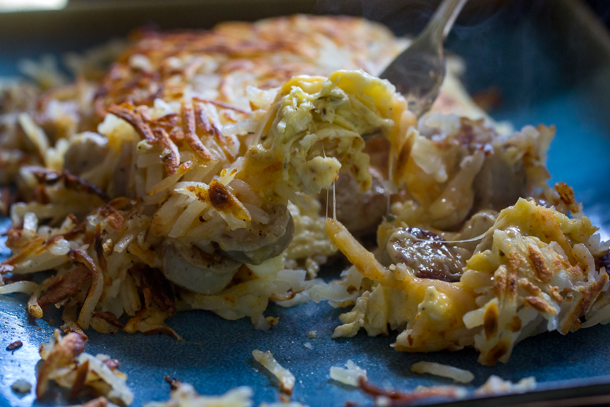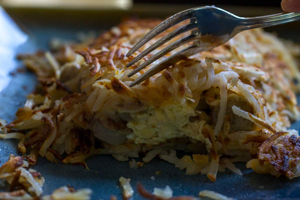 Then, once the eggs are scrambled, the sausage is browned, and the cheese is melted you just pile them on top of one half of the hash browns, cover with the other half, and serve.