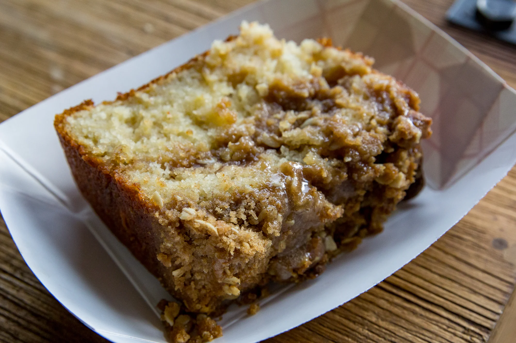 - Pour half of the batter into the baking pan. Top with half of the crumb mixture. Spread the remaining half of the batter on top. Add 1 cup of oats to the remaining crumb. Spread on top of the cake.