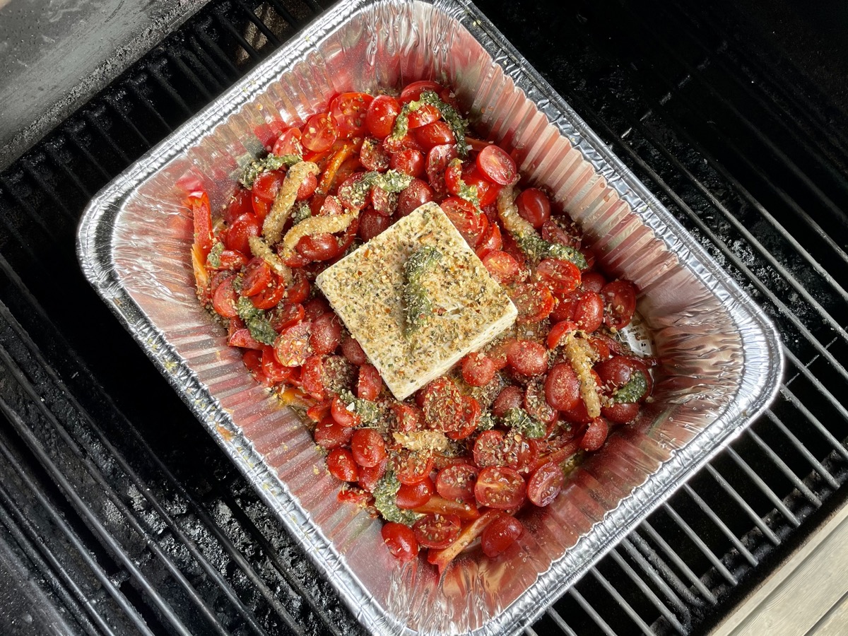 - Pour the olive oil into the bottom of a high-sided grill-safe pan. We used a disposable foil pan for ours. Next, add the feta in the middle, add all of the vegetables around the feta, and top with the herbs, garlic, and other seasonings. Gently pour in the white wine last.