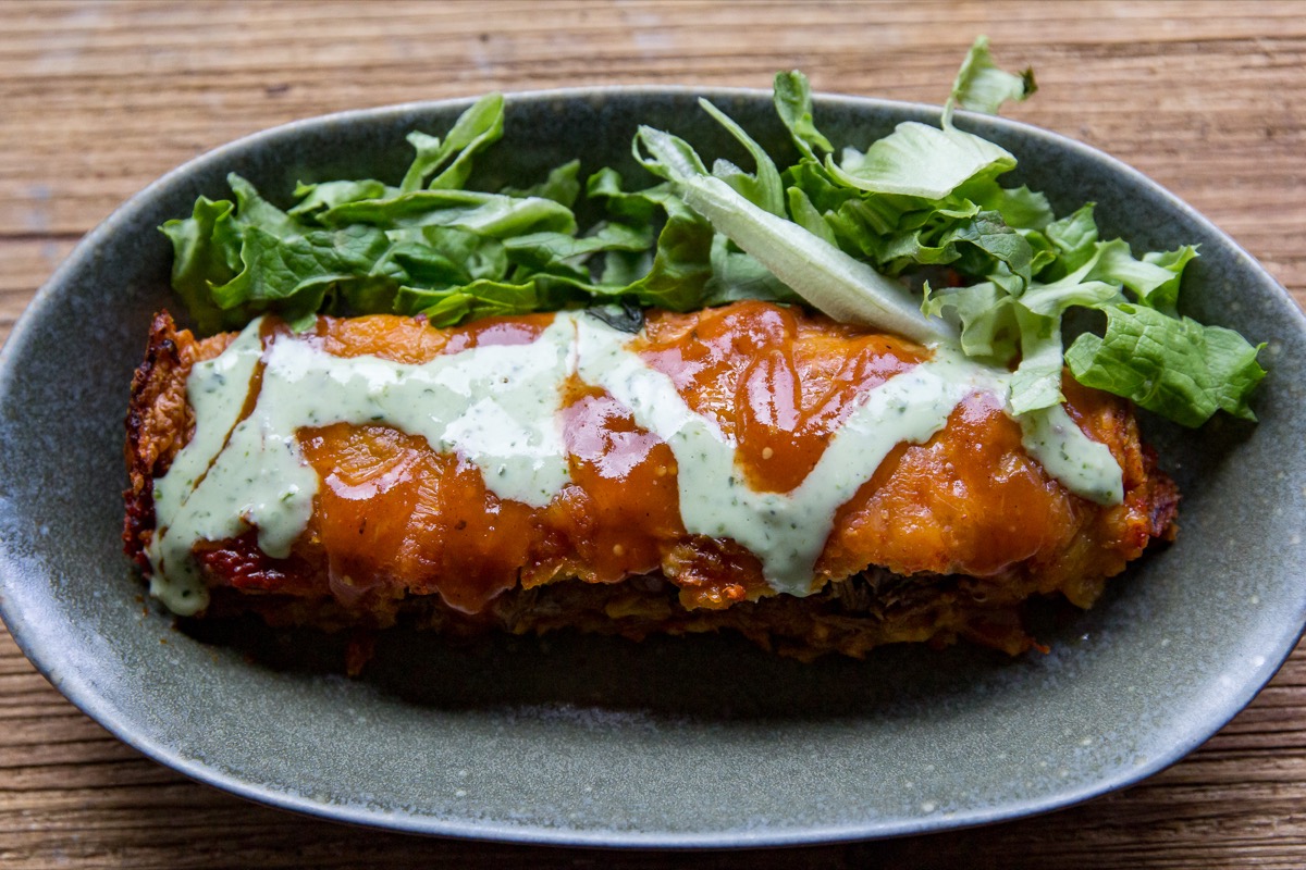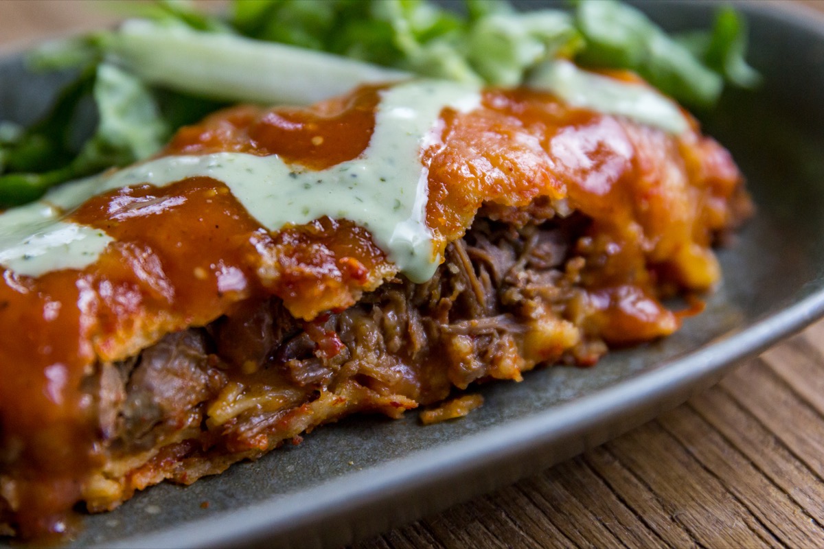 Tender shredded smoked beef with all of the cheese and all of the enchilada sauce you can handle!