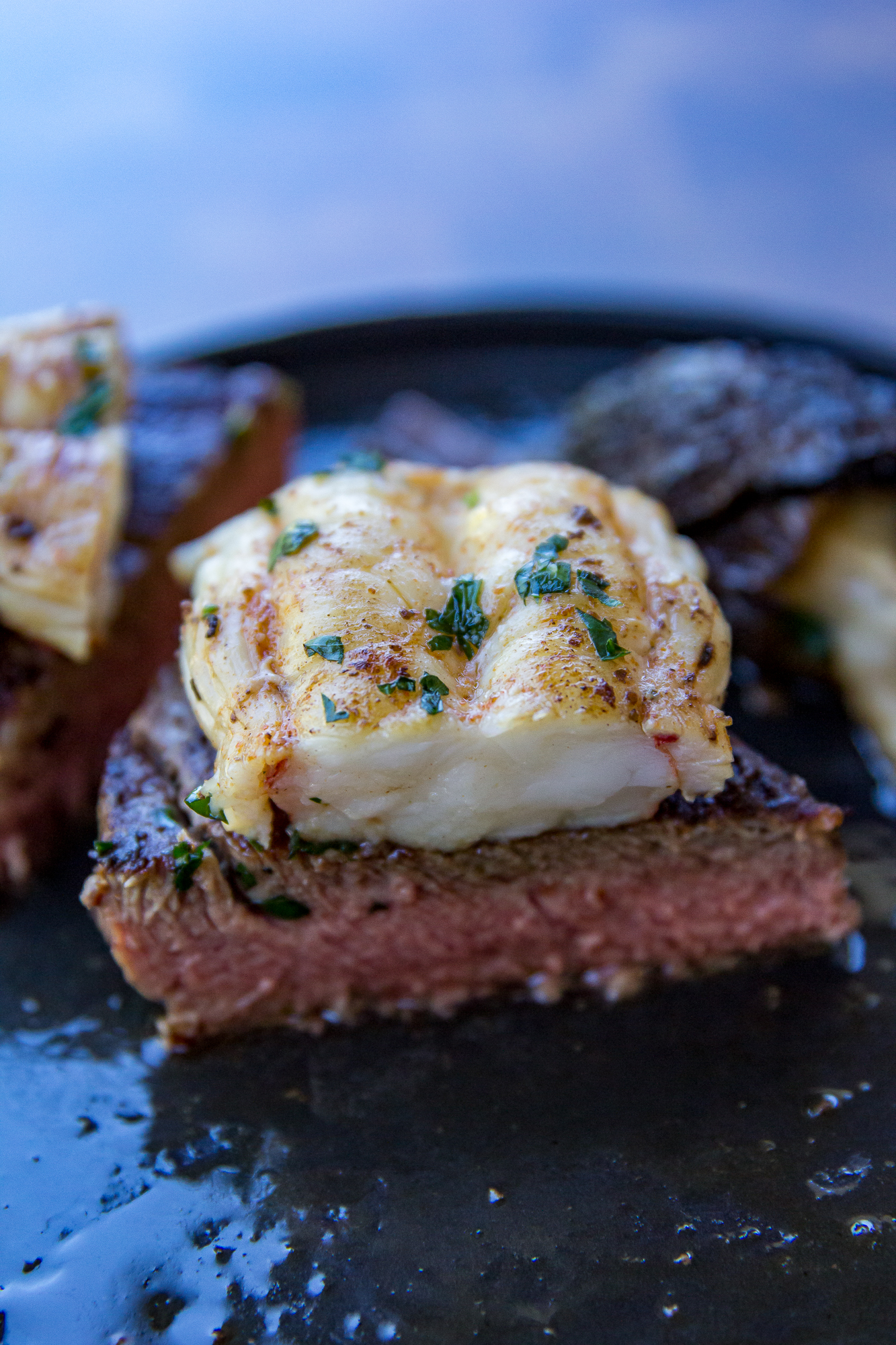 - Pull the lobster from the grill and place it on top of your steak and serve.