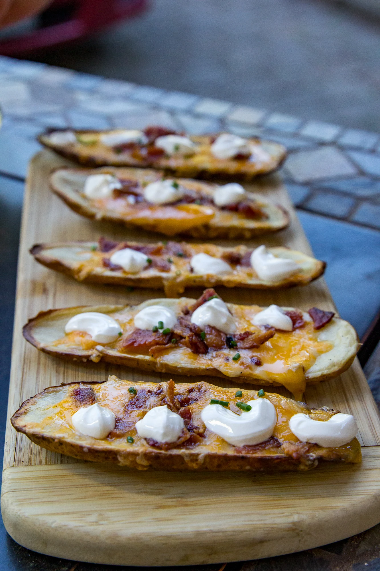 - Get smoking – You'll need an hour or two to smoke your potato skins before the toppings go on. So, get smoking and cook your bacon while you wait.