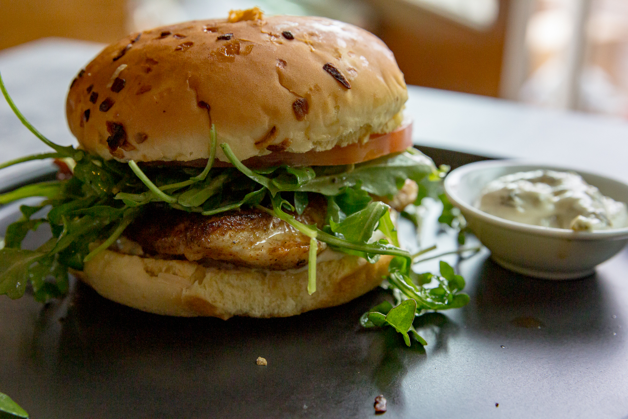 - Build your sandwiches - Toasted buns are not optional for me, but you do we. Top with arugula. We dressed ours with a homemade vinaigrette, but plain arugula are also a legit option here. As is a squeeze of lemon and a light toss with oil and vinegar. Again, the world is your oyster.