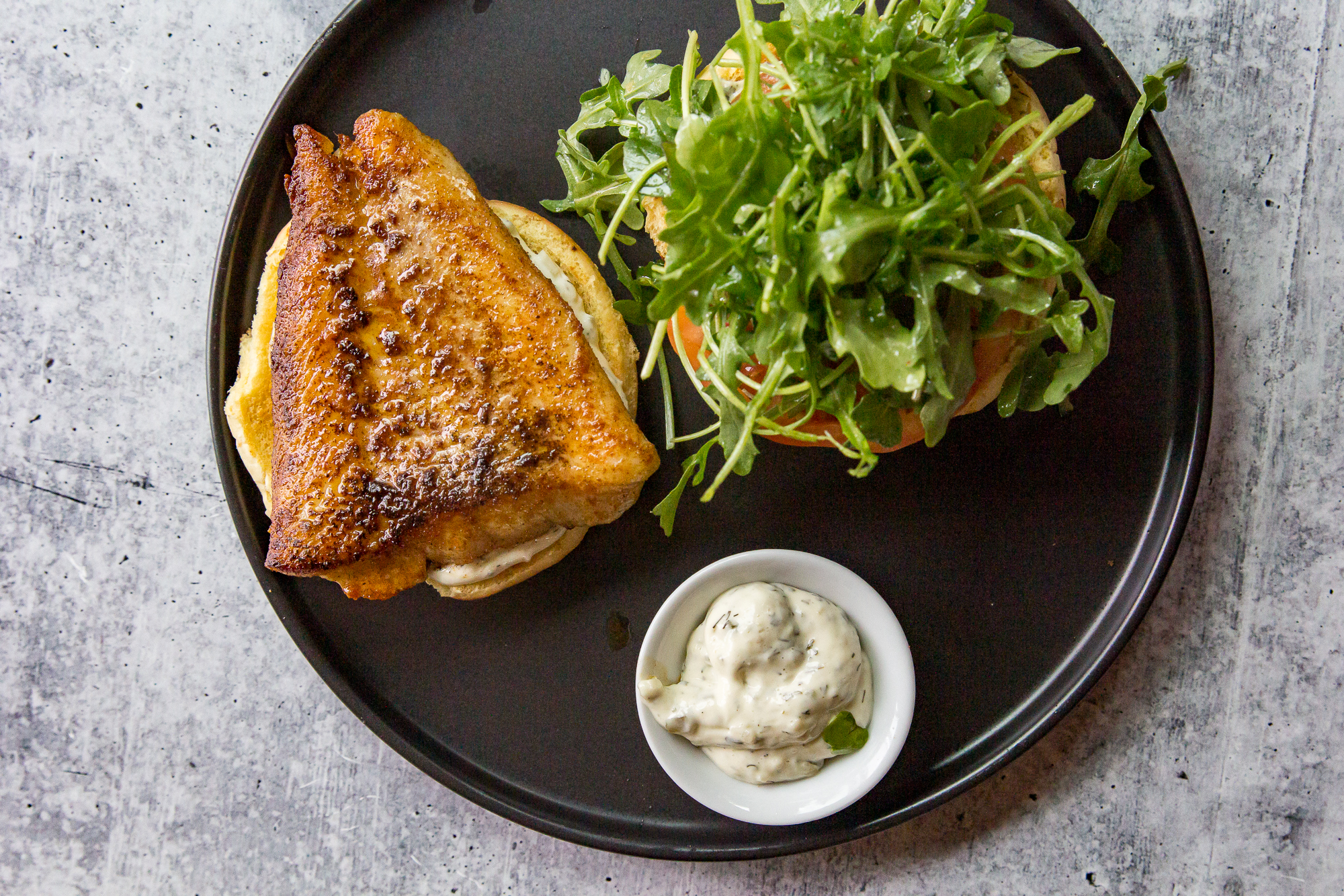 - Toast the buns and top with the fish and some baby arugula and tartar sauce or mayo, if so desired.