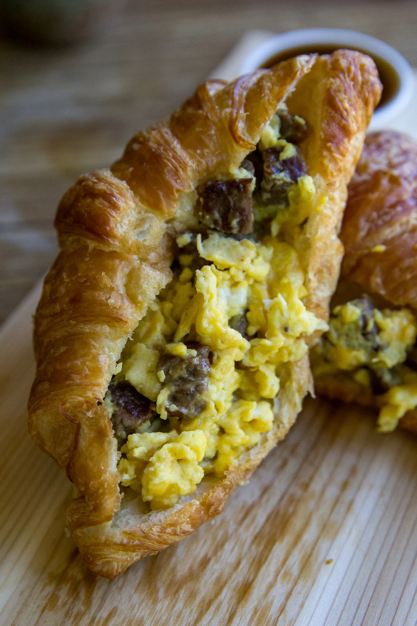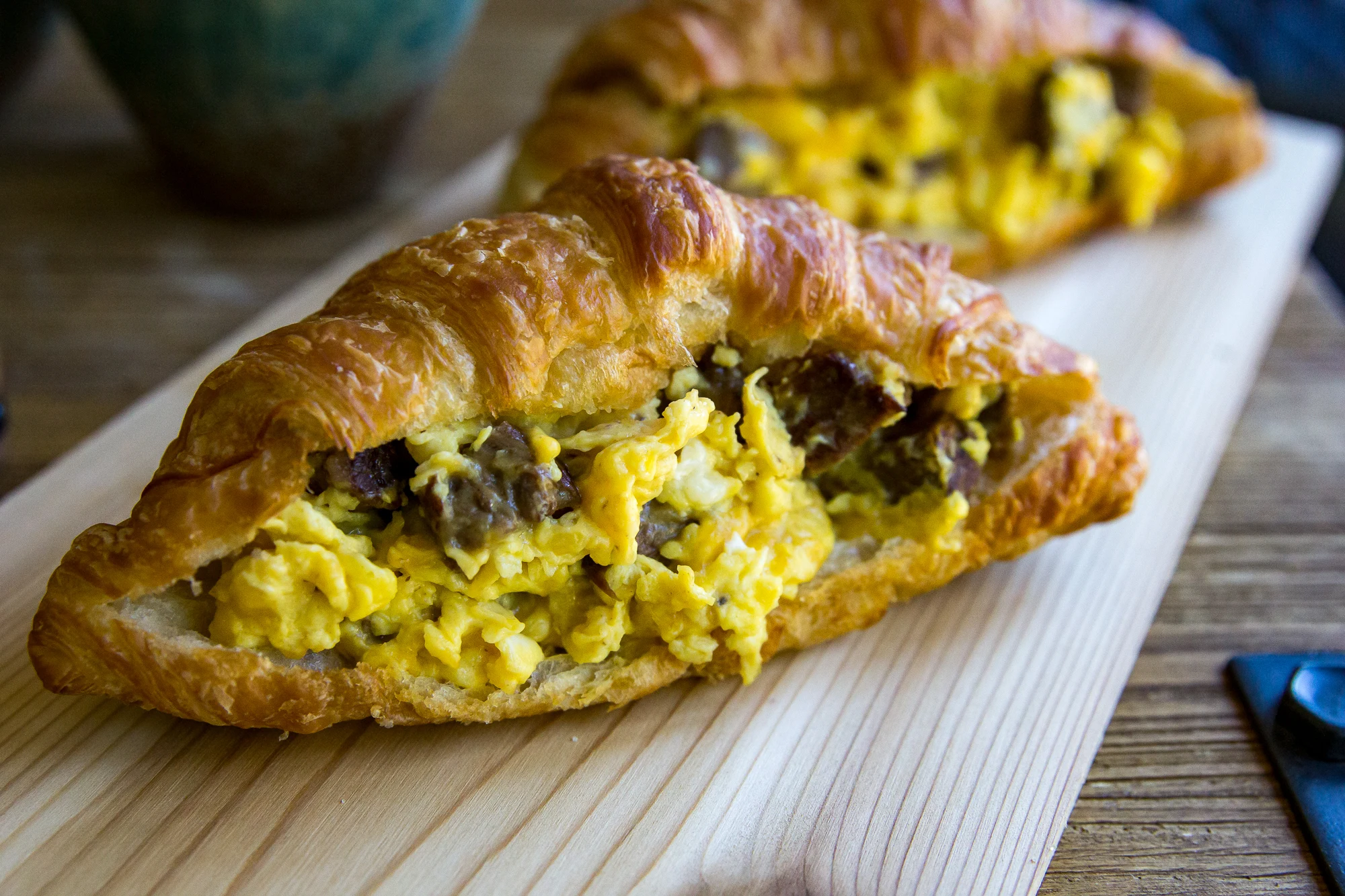 Our Stuffed Breakfast Croissant with steak takes steak and eggs to a whole new buttery, flaky level. The perfect grab-and-go breakfast, we take fluffy farm-fresh scrambled eggs, toss in some cubed ribeye, and then throw down all the cheese for a filling, hearty, breakfast.
