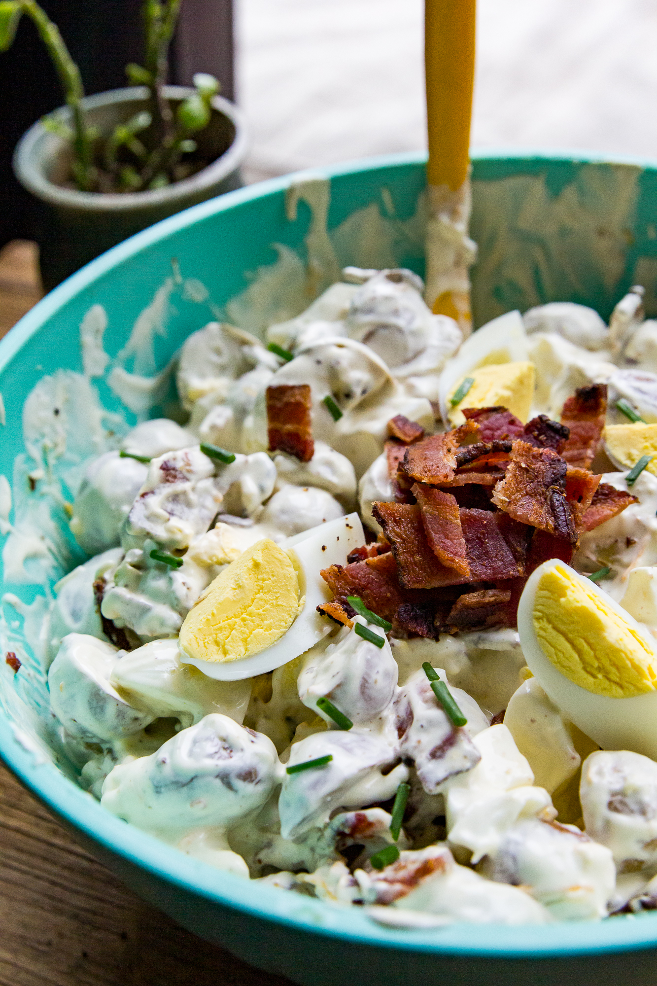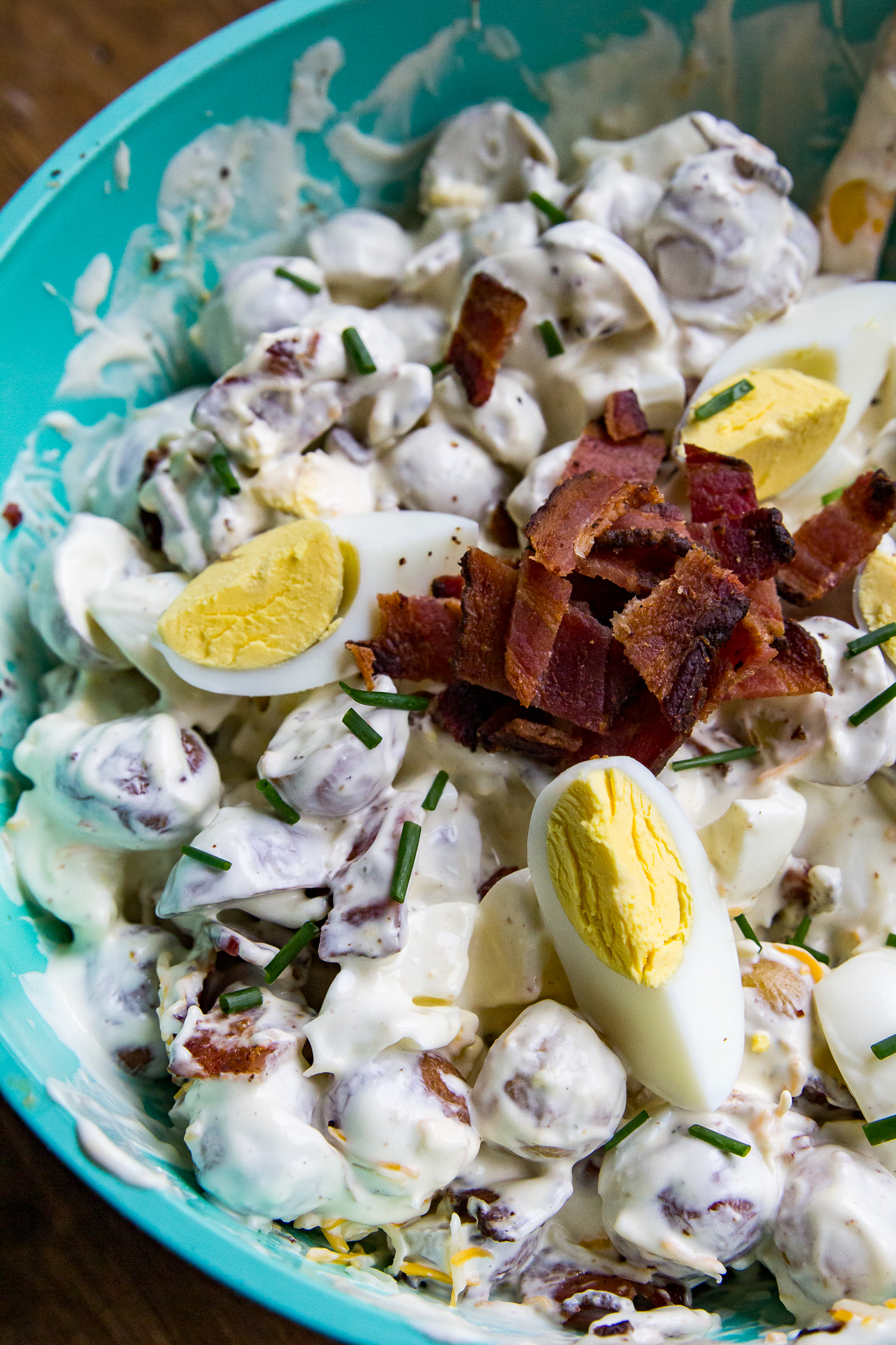 - Finishing touches - Right before serving, mix in the chopped bacon, chives, and cheese. Serve cold!