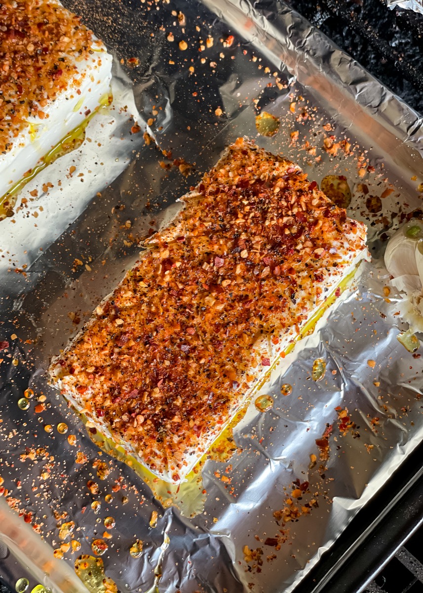 - Put non-stick foil onto a baking sheet. Place the cream cheese onto the foil and drizzle the oil on top. Make some 1/2 inch thick scores on the top of the cream cheese. Sprinkle the rub on top of the block.