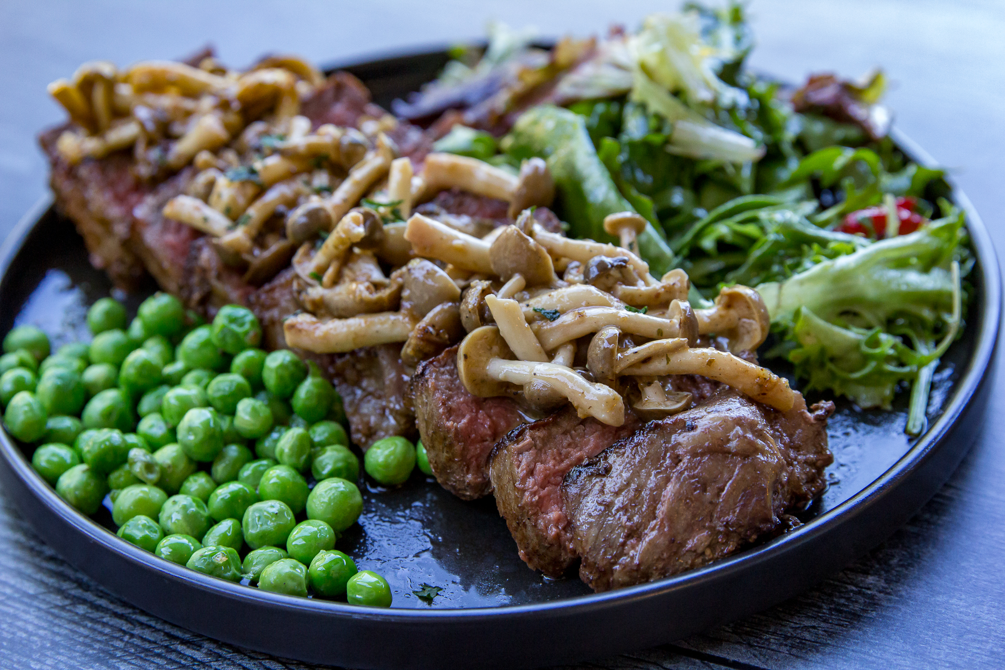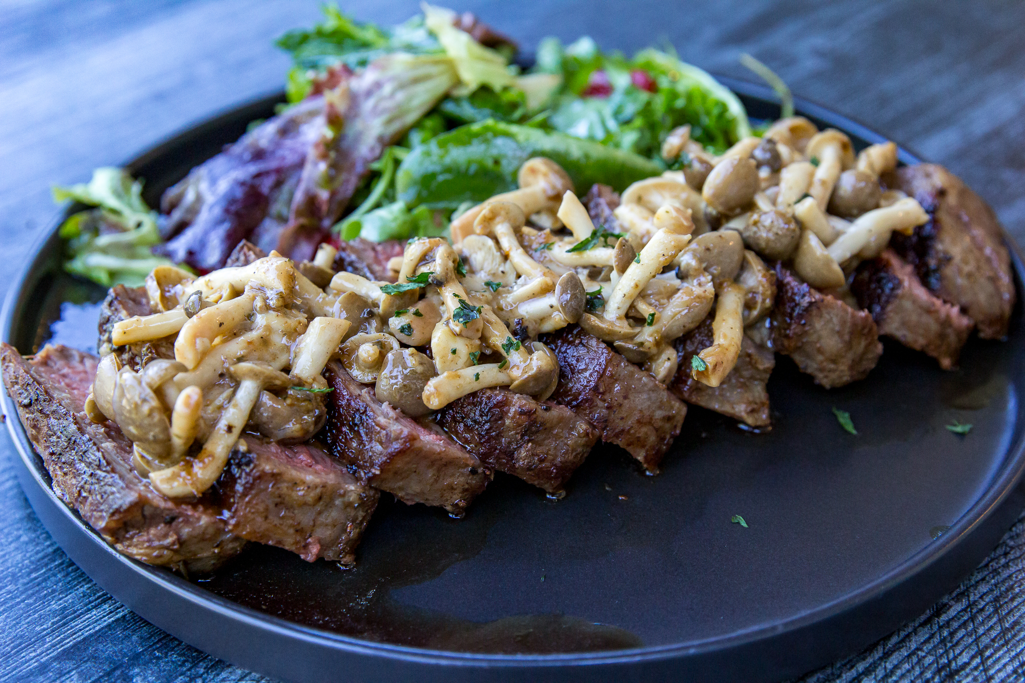 Blackstone Marinated Mushrooms are one of the easiest side dishes you can make, and they are so fresh, bright, and earthy! We served these on top of a ribeye, but they would be equally as good on their own, in an omelet, or mixed into some pasta.