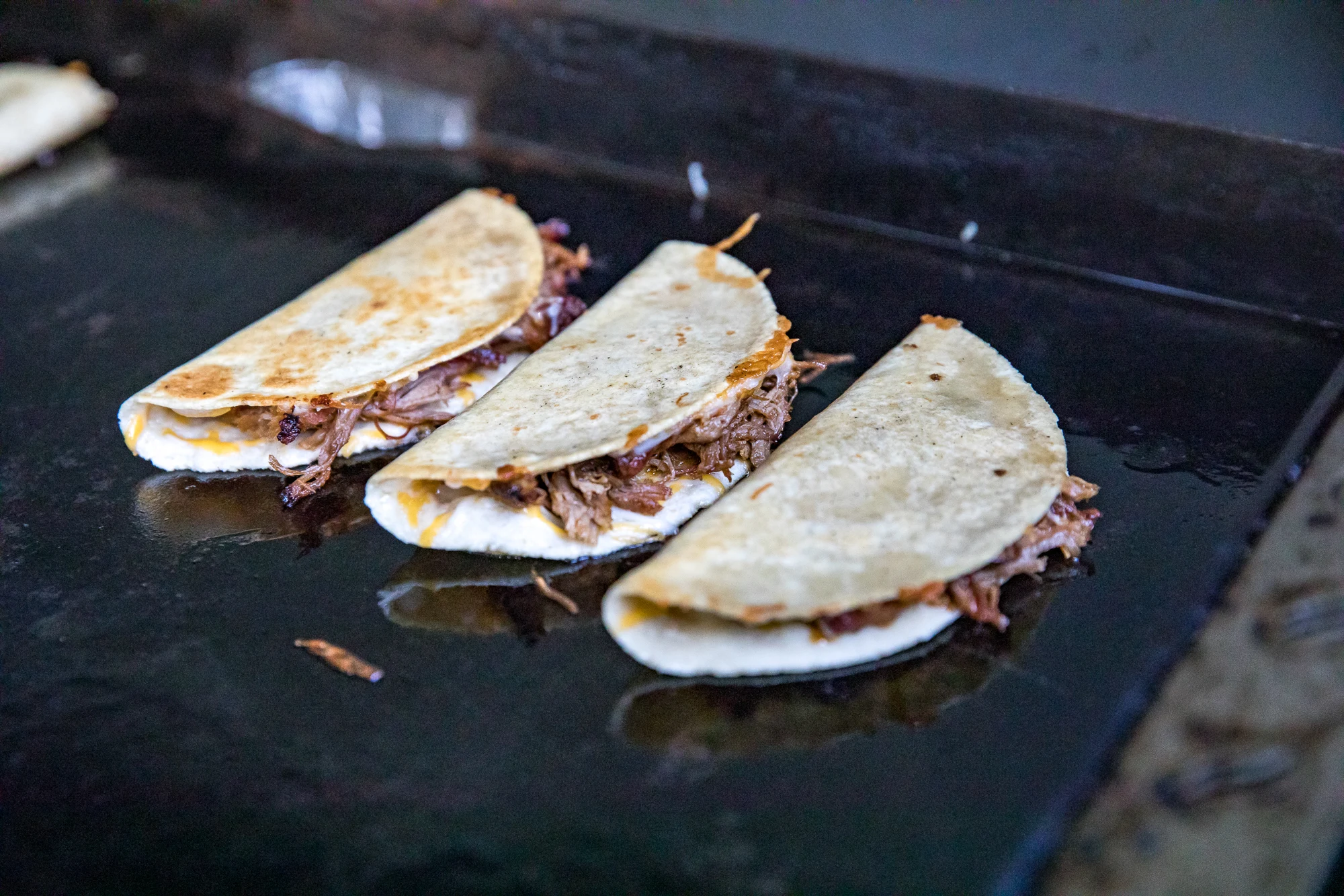 With this recipe, we're assuming you already have your pork pulled. If you don't, you'd better fire up the smoker because you're behind schedule. This is a perfect way to use up leftovers. I love the way the Blackstone lets us do a ton of these all at once, and how it crisps up the tortilla while it cooks.