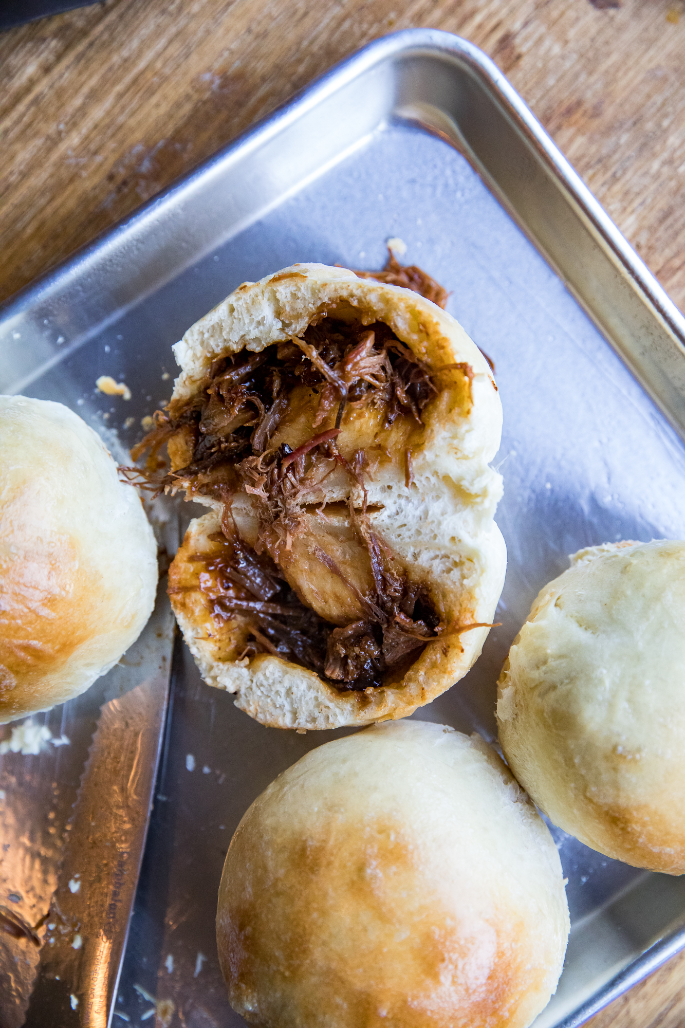 - Stuff those buns - Make a small disc with a handfull of dough, and place a few tablespoons of brisket inside. We threw some bbq sauce on top for good measure too. Pinch together the sides to surround the filling and continue pinching and turning until it is sealed. Place the bun seam-side down on a prepared baking sheet.