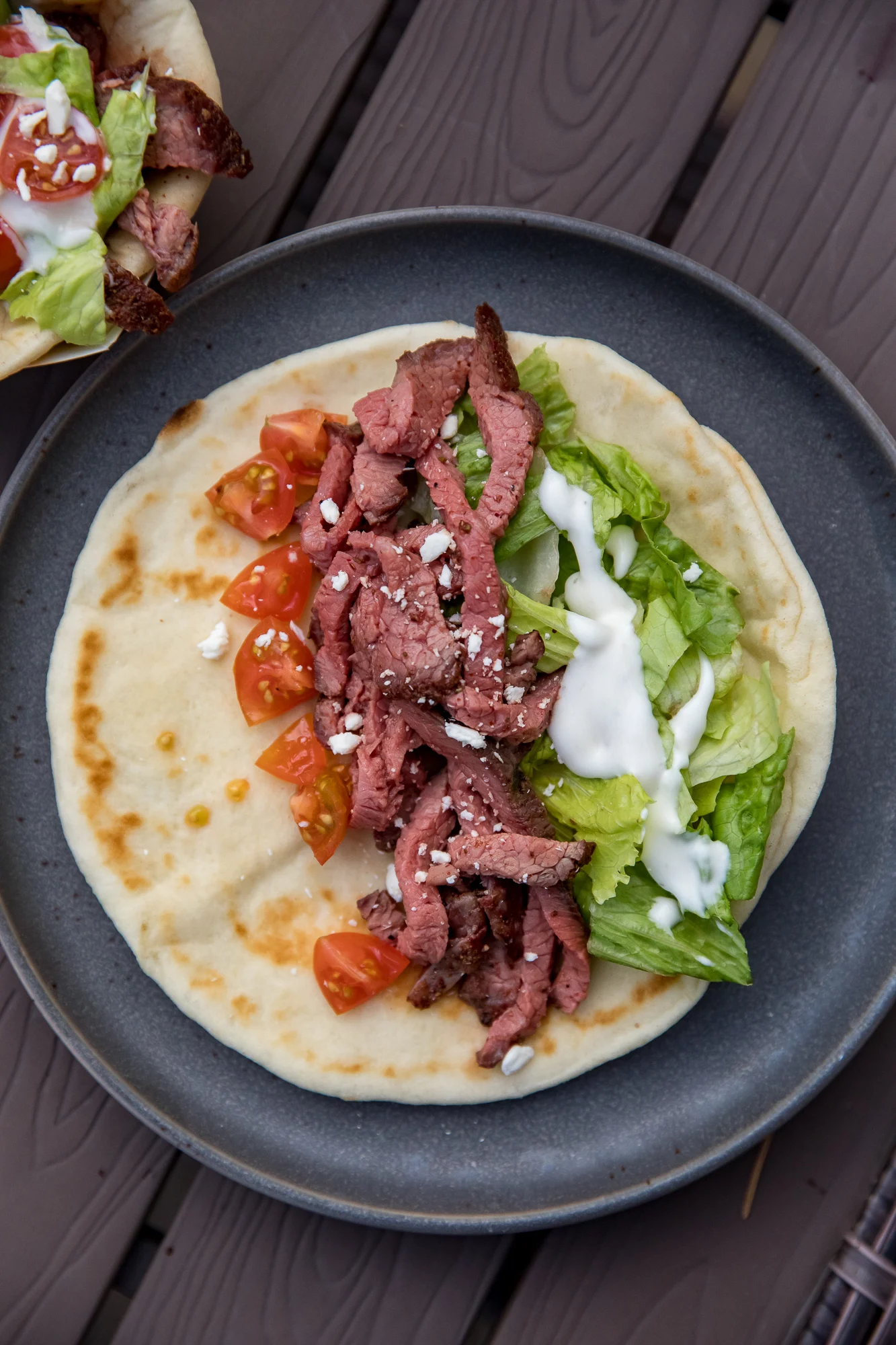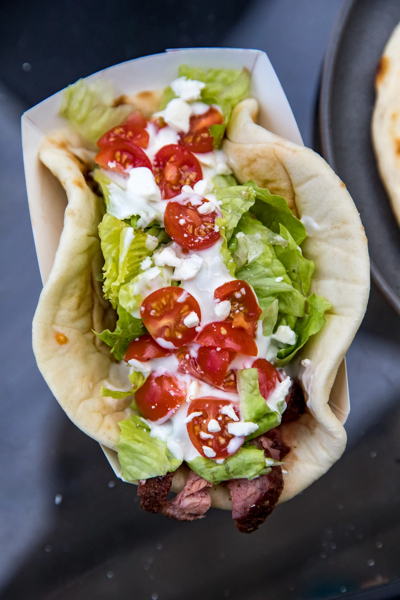 - Load up your pita with sliced beef, lettuce, tomato, and bleu cheese dressing.