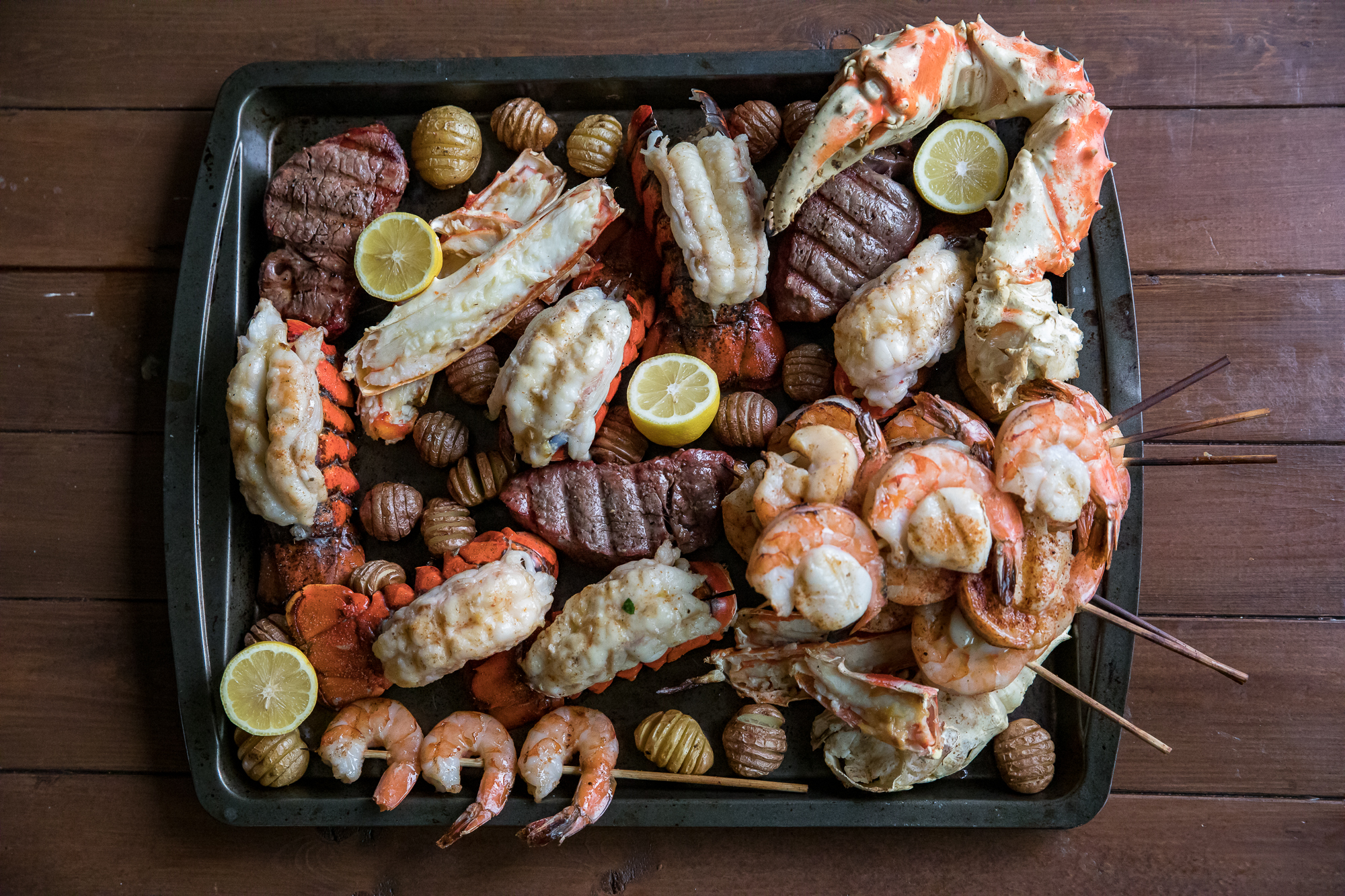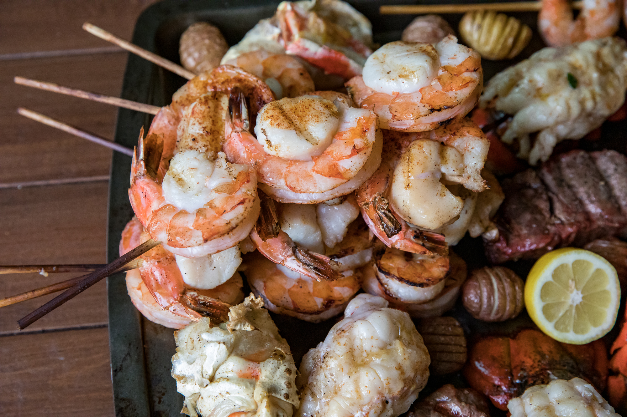 Tender collossial shrimp. Giant sweet sea scallops. Both skewered, lightly seasoned, and tossed right onto the grates of a hot grill.