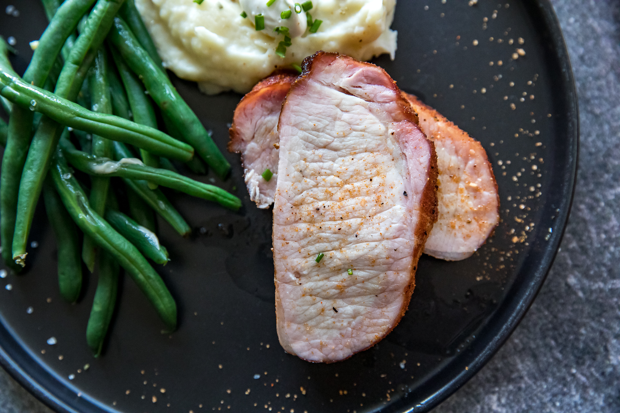 - Slice and enjoy - Slice the loin into 1 - 1 ½ inch thick slices and serve with your favorite sides. We liked steamed buttered green beans and garlic mashed potatoes.