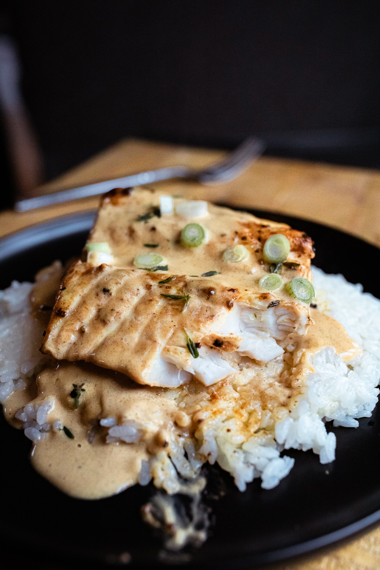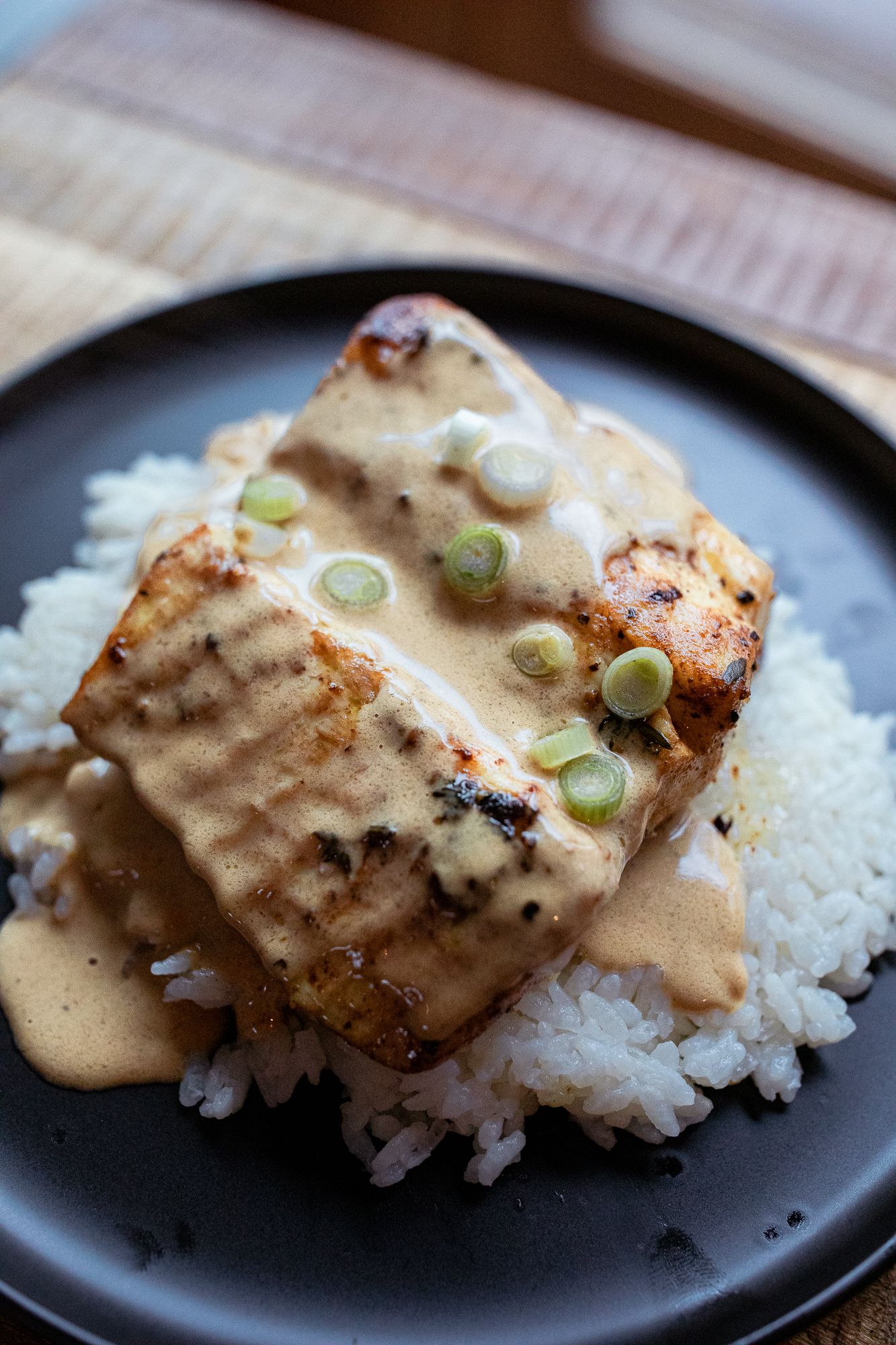 - Serve - We served this over rice with a generous pour of sauce, and sprinkled with green onions and some more lemon juice.