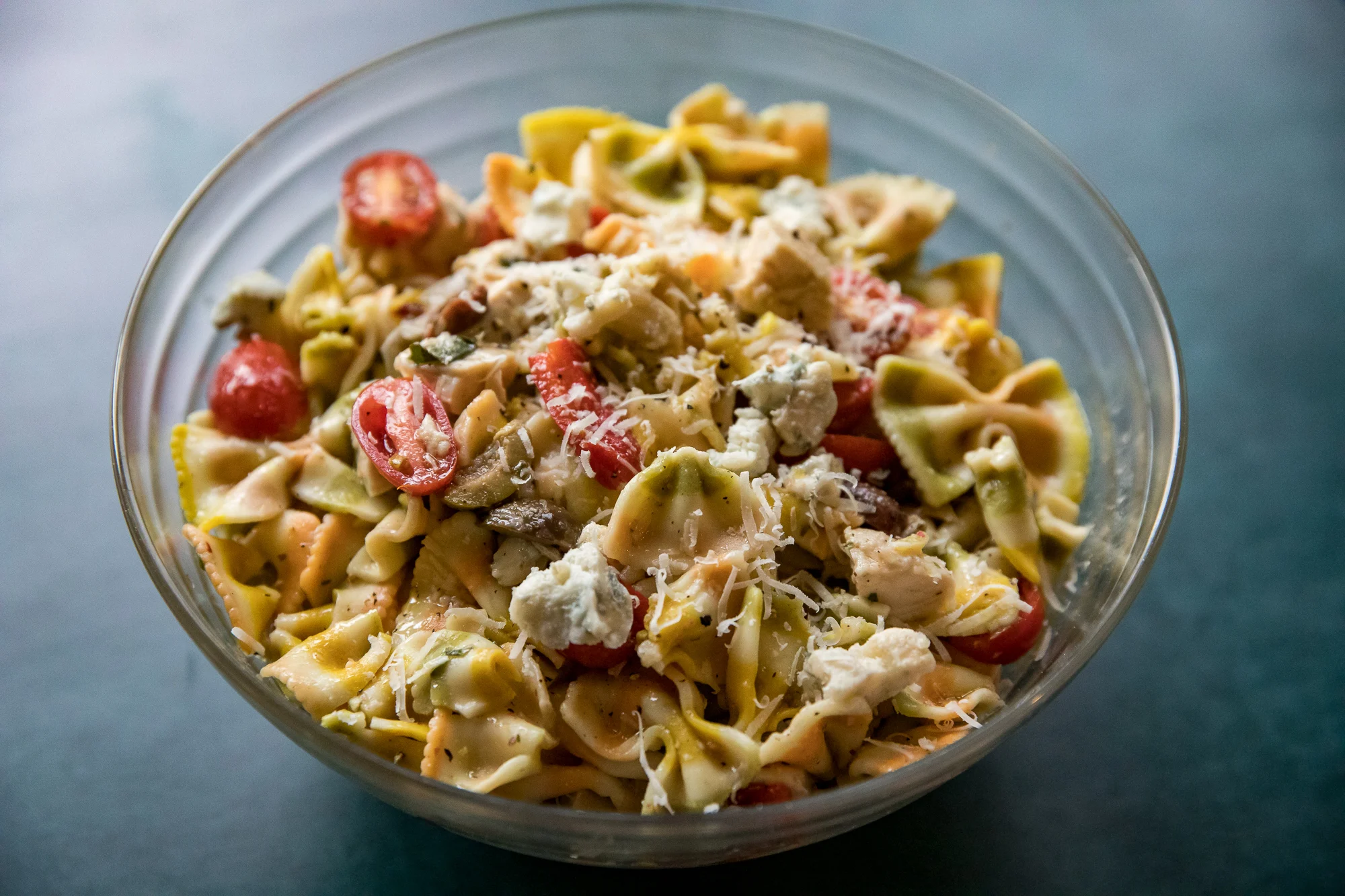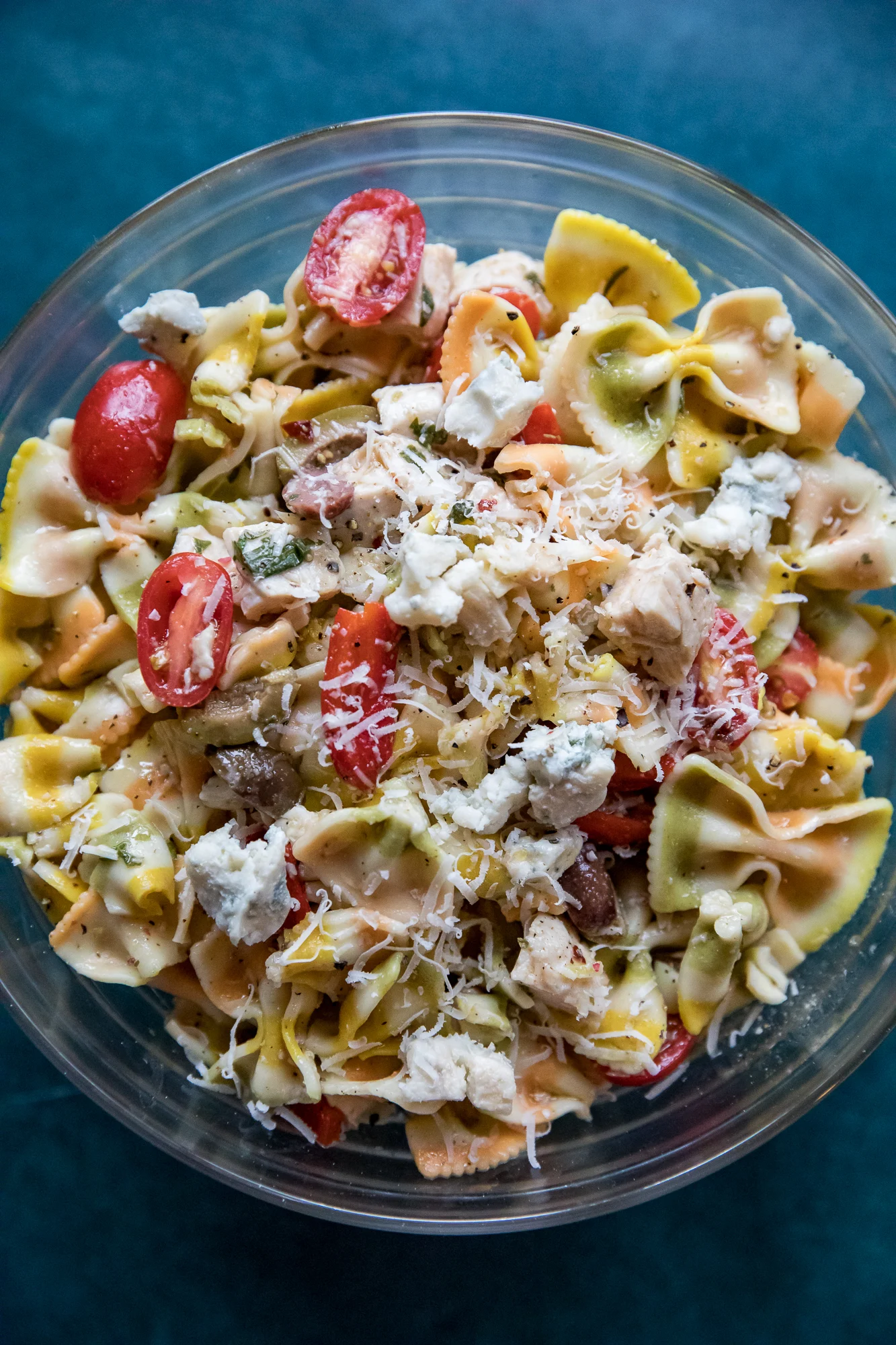 - Combine the cherry tomatoes, olives, diced cucumber, crumbled gorgonzola, and fresh oregano with the salad dressing. Toss to evenly coat all of the vegetables. Mix in the pasta, and top with the shredded parmesan and diced grilled chicken.