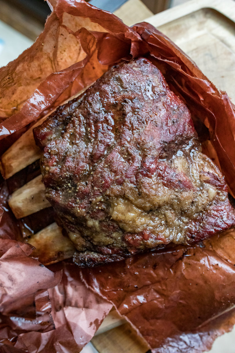 Wrap up the ribs in pink butcher paper and put them back on the grill. Cook wrapped for another 1 1/2 – 2 hours, or until the ribs are probe tender.