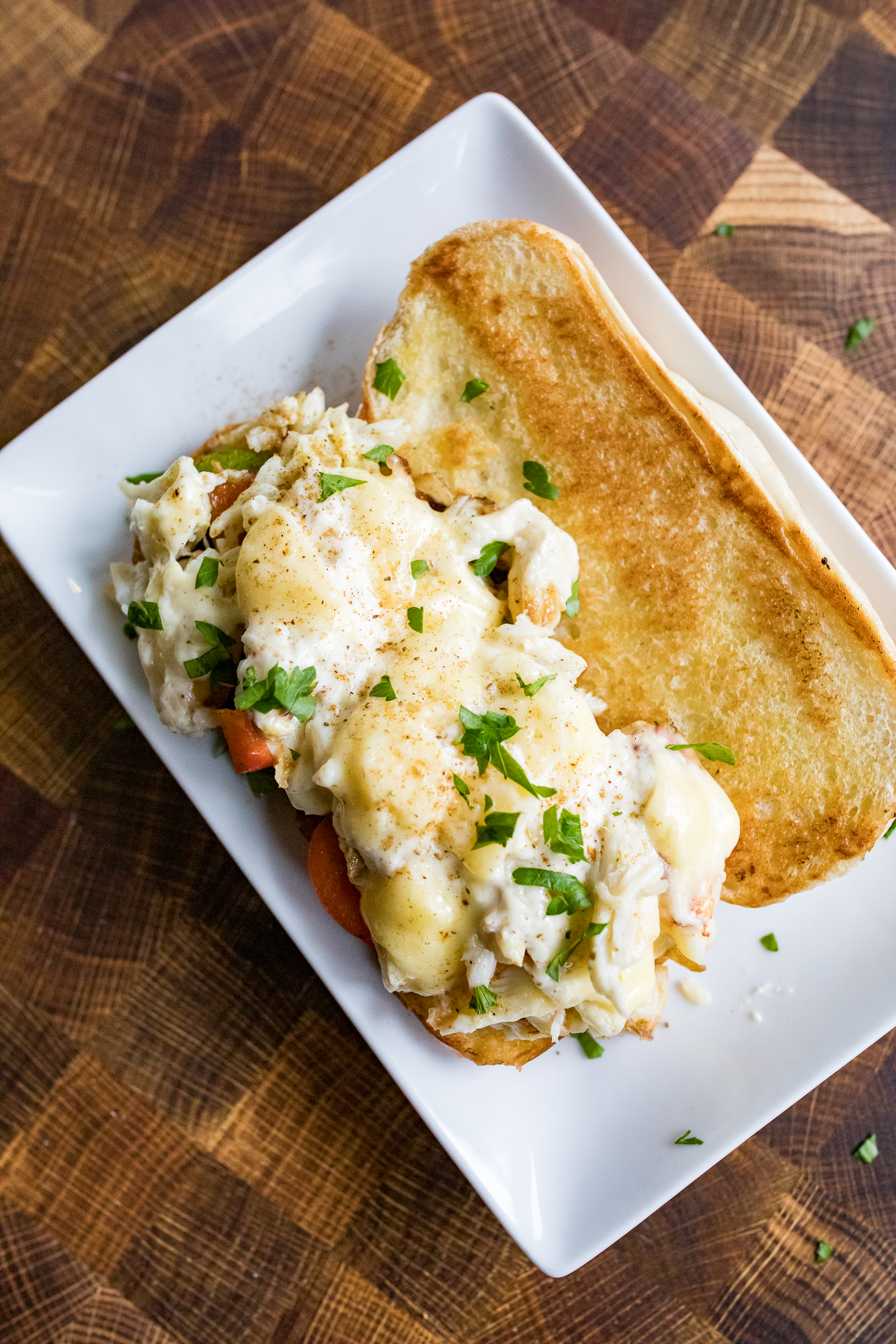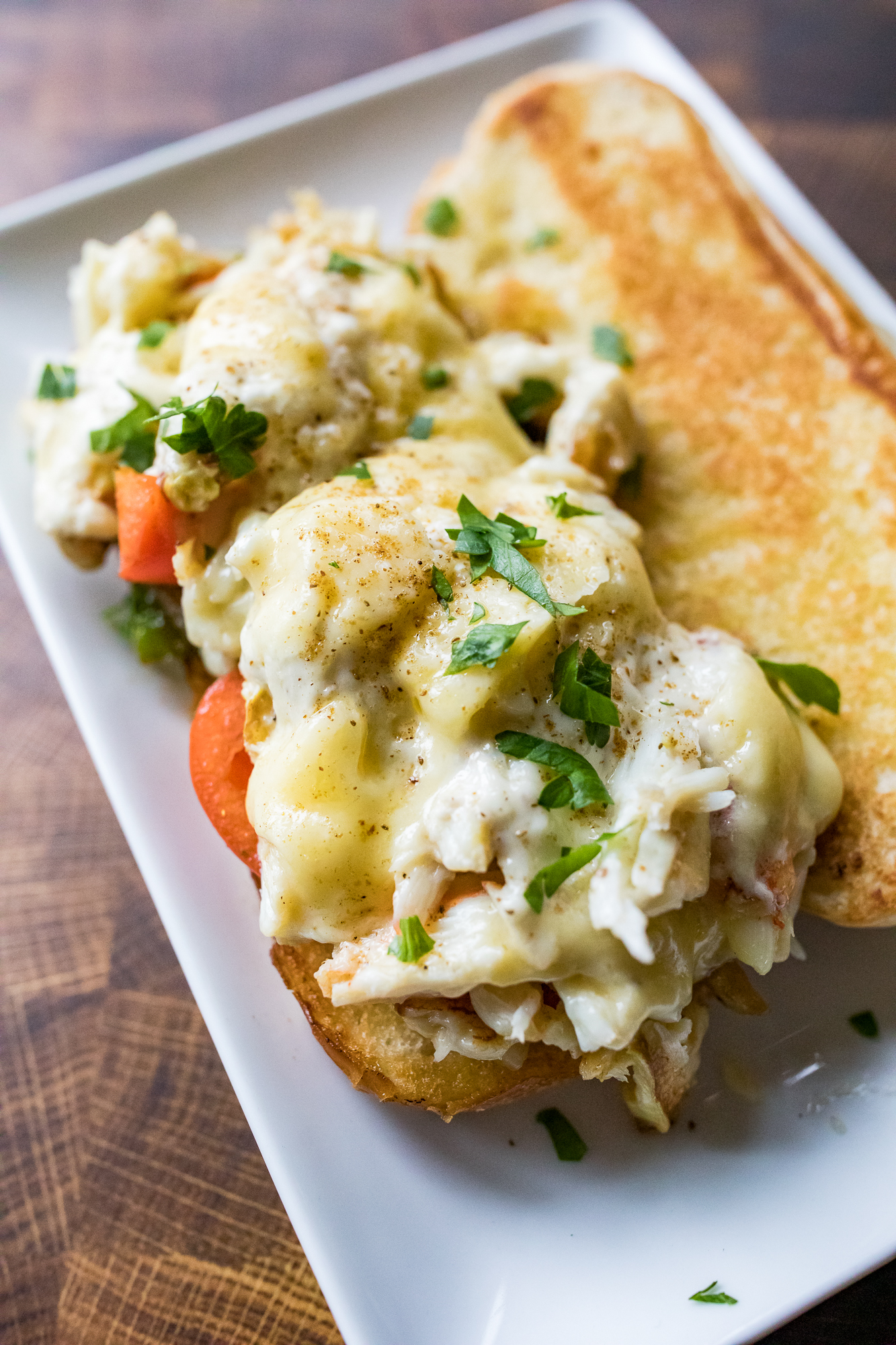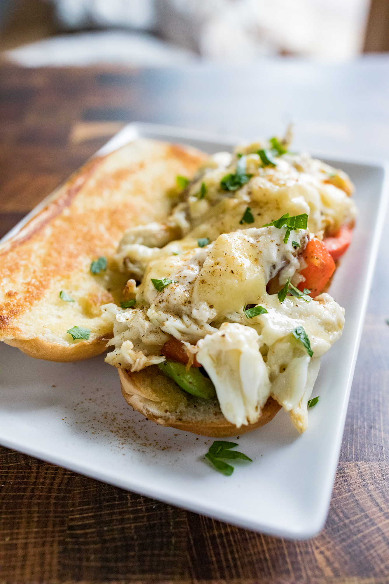 - ASSEMBLE - Take the hoagie, shovel some of the melty, cheesy, crab mix on top along with some of those onions and pepper and enjoy!