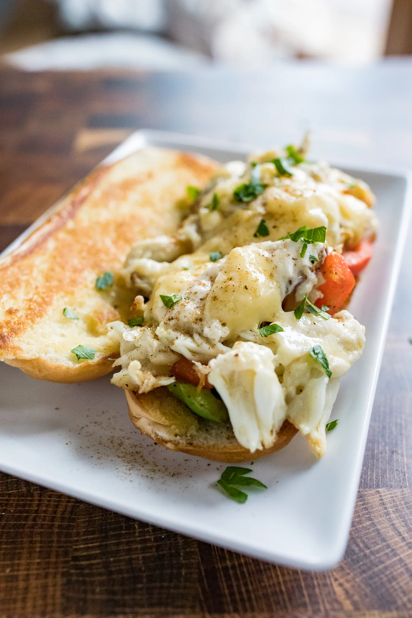 - ASSEMBLE – Take the hoagie, shovel some of the melty, cheesy, crab mix on top along with some of those onions and pepper and enjoy!