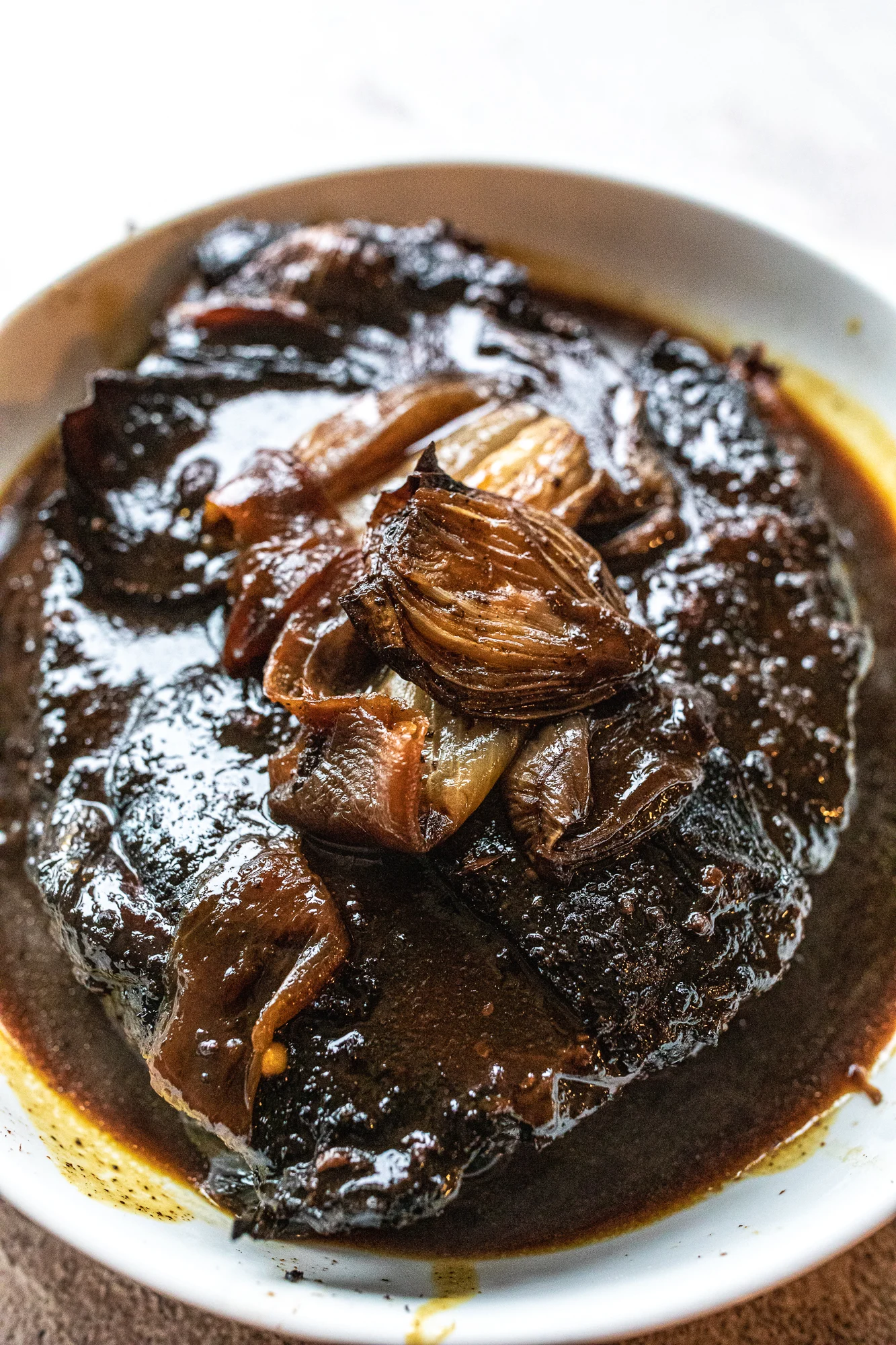 Keep an eye on the level of liquid. Cooking uncovered will yield a more prominent “wood fired” flavor, but it also causes the braising liquid to evaporate so you might have to add some more water or beef broth to keep the level up. - Enjoy – Once the roast is fork tender, portion out, serve with some potatoes or buttered noodles, and pour the braising liquid over the top! If you would rather have it in a more gravy-like manner, you can thicken with a butter roux or a cornstarch slurry (directions in the recipe card below.)